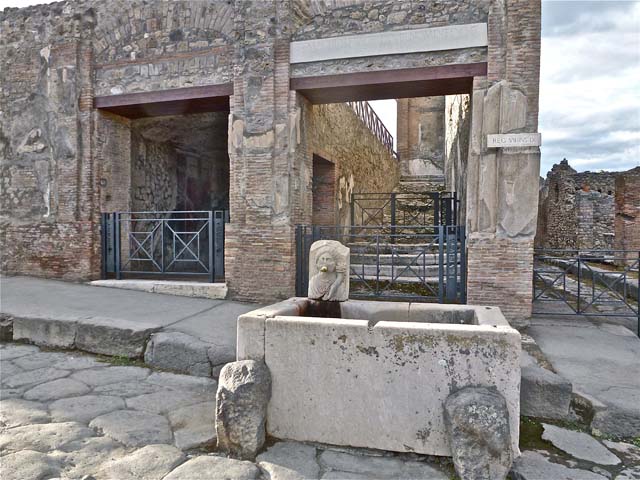 VII.9.68/67 Pompeii. September 2011. Looking north to entrance doorway on left side of fountain. Photo courtesy of Michael Binns.