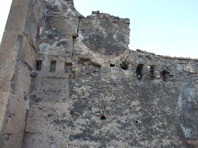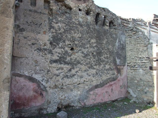 VII.13.1 Pompeii. December 2007. West wall of shop-room with remains of painted plaster.