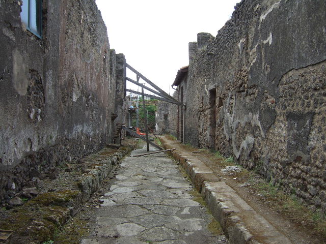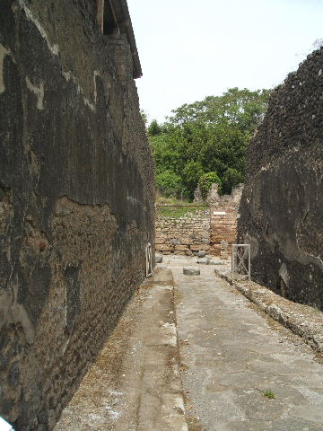 IX.8 Pompeii, on left. May 2006. Vicolo del Centenario, looking south from outside IX.5.13, on right.
