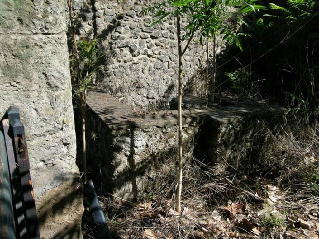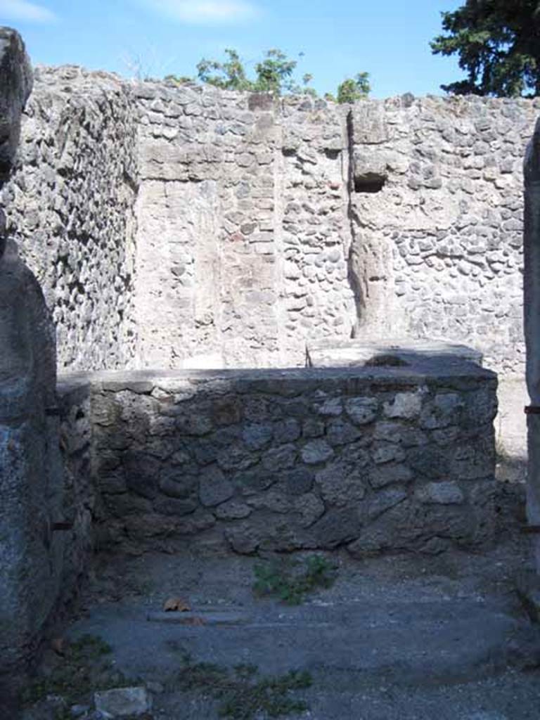I.1.1 Pompeii. September 2005. Stone podium or sales counter, with hearth. Looking east.