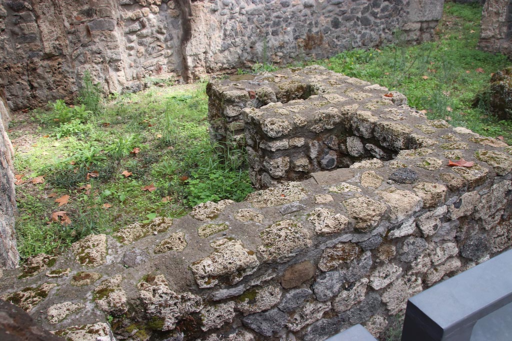 I.1.1 Pompeii. October 2024. Looking south-east across podium or sales counter, with hearth. Photo courtesy of Klaus Heese.