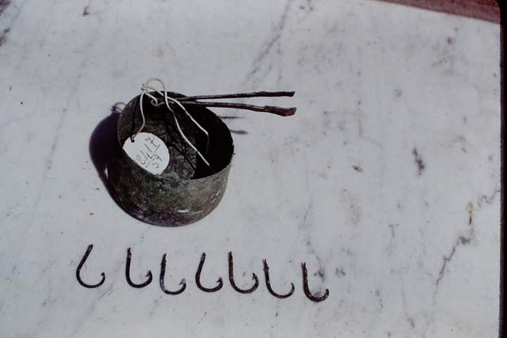Pompeii. 1973. Bronze container and fish hooks. Photo by Stanley A. Jashemski.