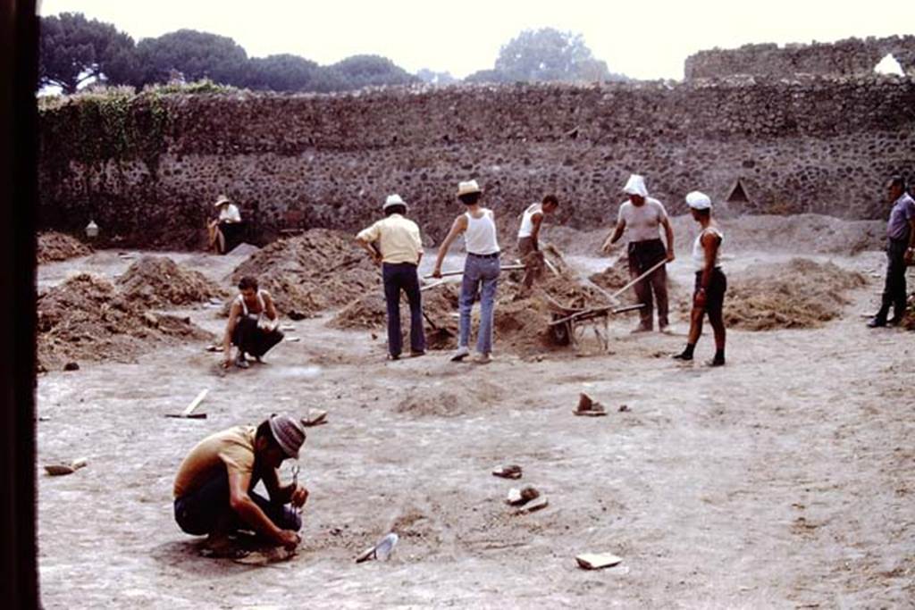 I.20.5 Pompeii. 1972. Examining site of root cavities in south-east corner. Photo by Stanley A. Jashemski.
