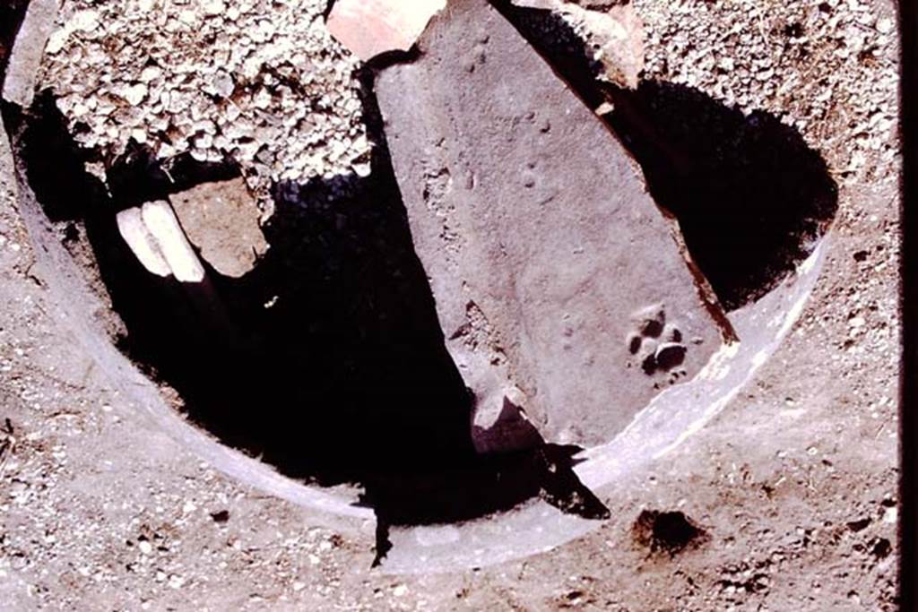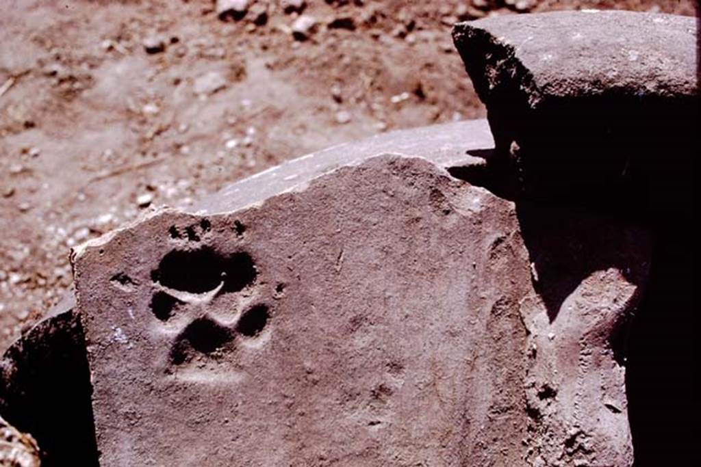 I.20.5 Pompeii. 1972. Dog paw imprint found on slab inside cistern. Photo by Stanley A. Jashemski.