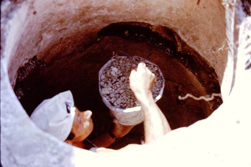 I.20.5 Pompeii. 1972. Worker inside the cistern handing up the bucketful of lapilli. Photo by Stanley A. Jashemski.