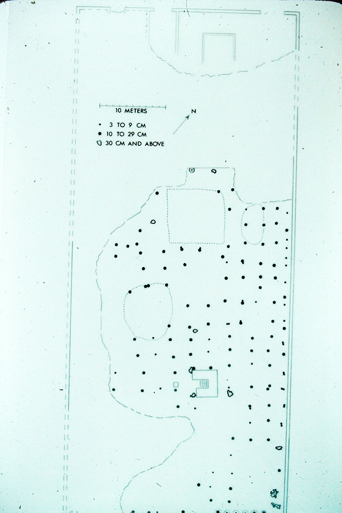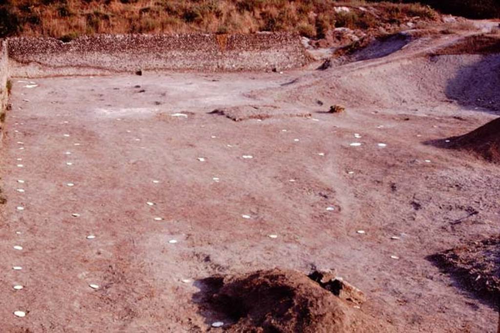 Looking south across site, with painted spheres marking the root cavities, which would be visible from the “balloon”. Photo by Stanley A. Jashemski.