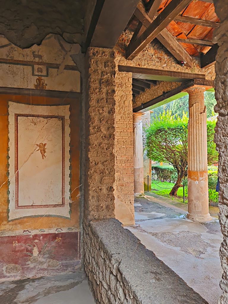 A flying cherub is on the near panel. The remains of a wall painting of Hermes and Dionysus is in the central wall panel.