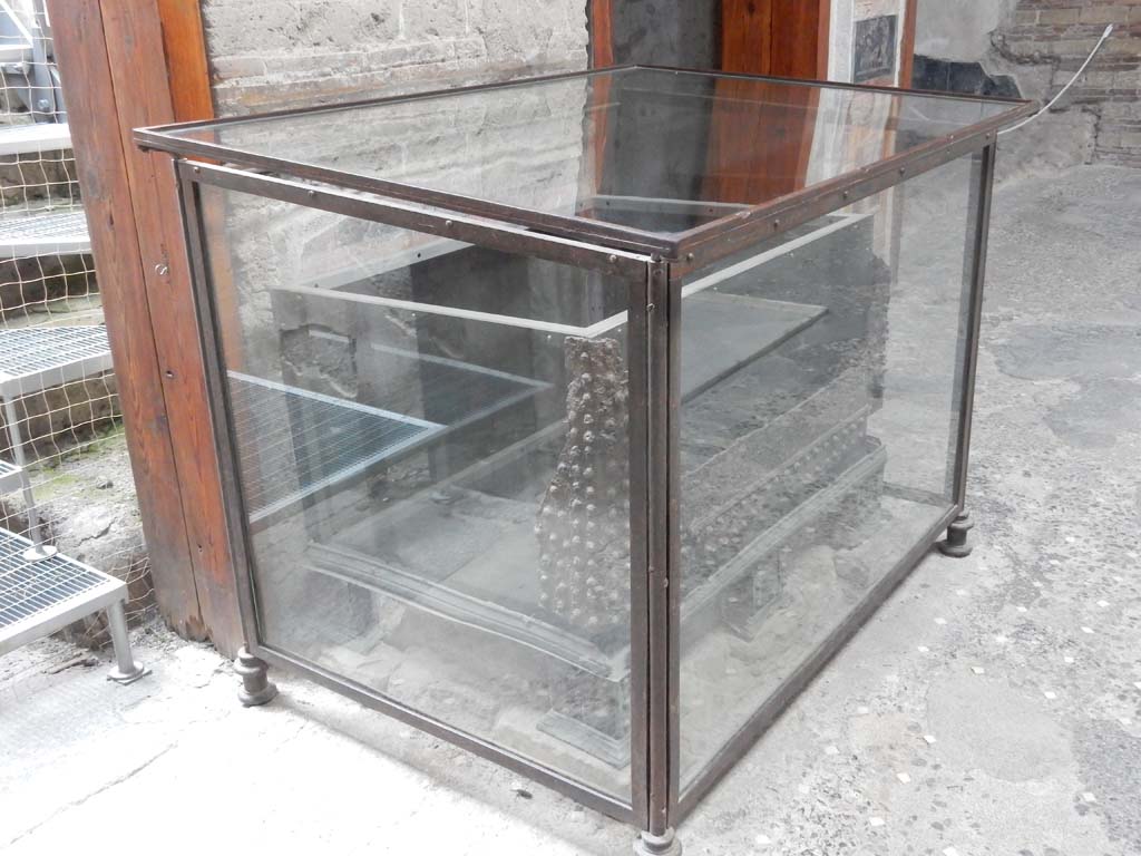 VI.15.1 Pompeii. December 2006. Looking into glass case on south side of atrium.