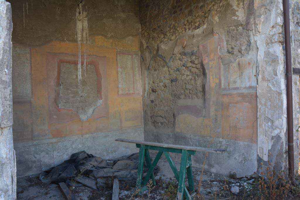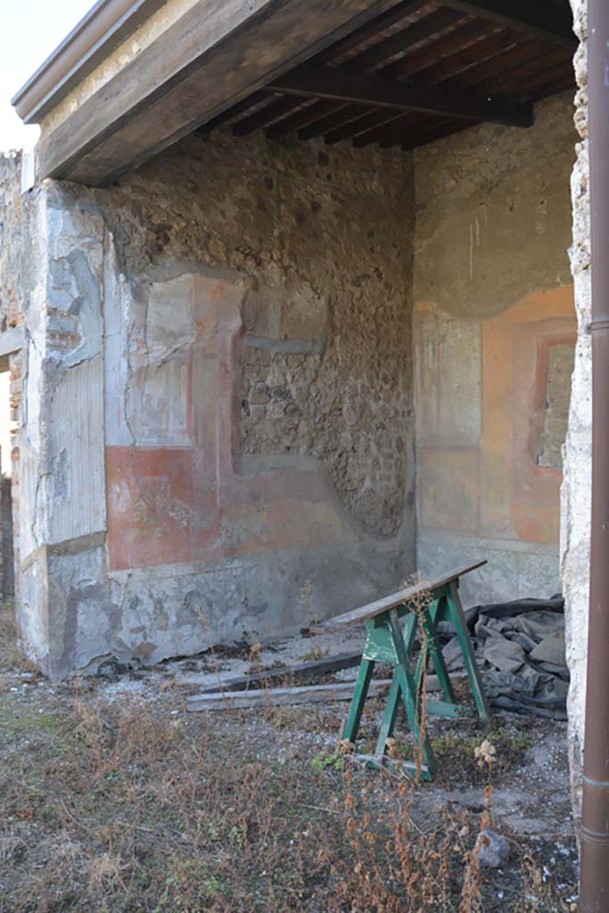 Pompeii. October 2019. Exedra 17, looking towards south wall, south-west corner