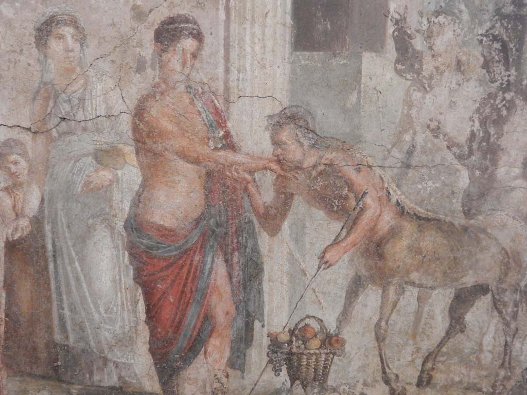 Room 17, detail from painting on west wall of exedra. Pirithous receiving homage from a centaur. Photo courtesy of Buzz Ferebee.
