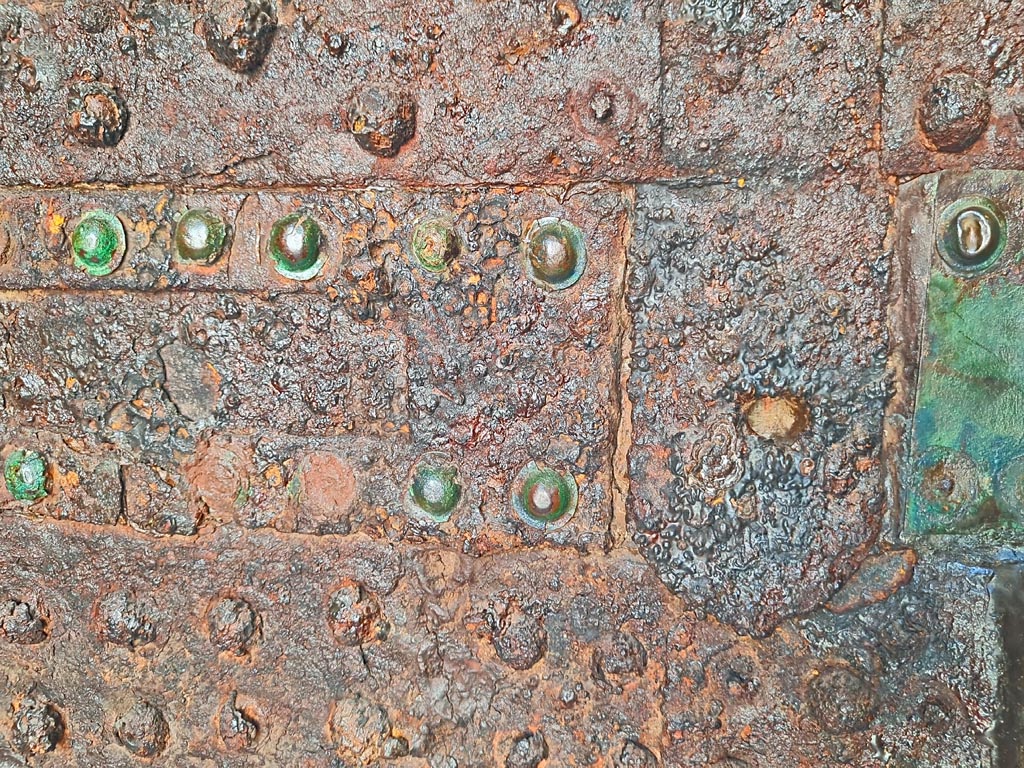 Detail of many nails decorating all sides of “arca”, storage/money-chest.