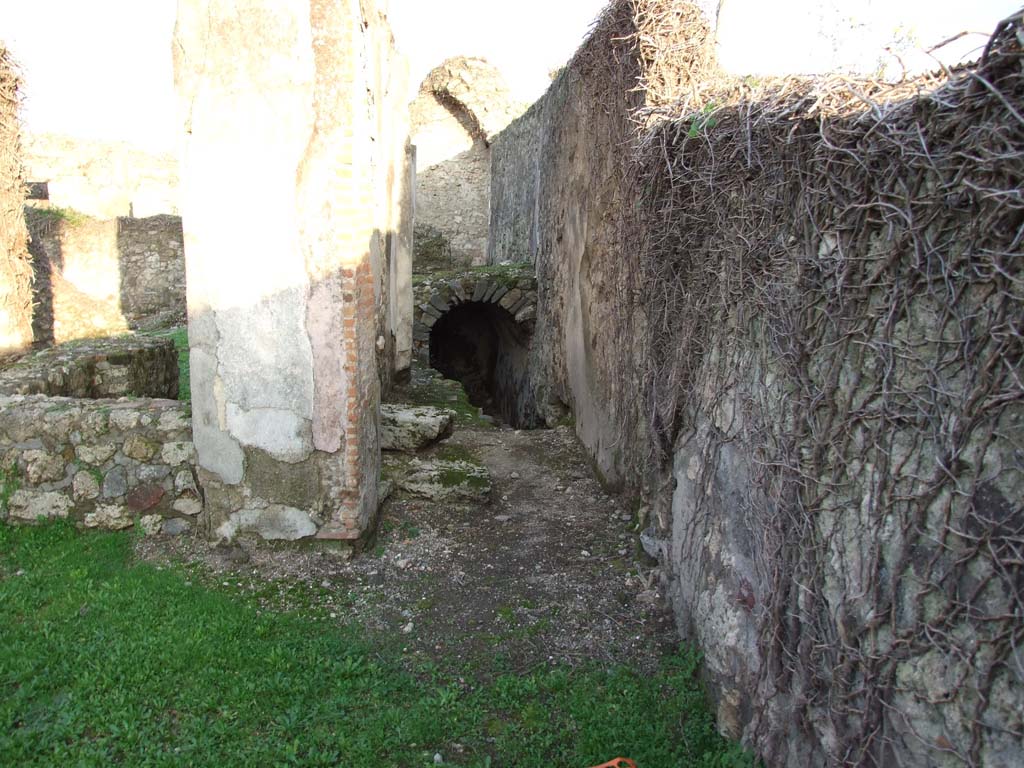 VII.2.23 Pompeii. December 2004. Looking east along entrance corridor, with doorway to latrine, on right.