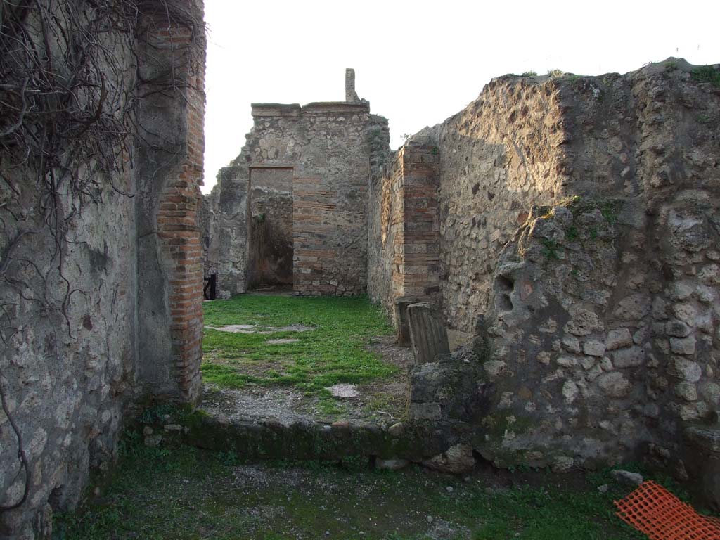 Looking west from rear through doorway of triclinium, across atrium, to the doorway to cubiculum on north side of entrance.