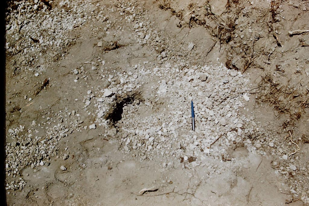 Looking north-west in trench towards circles of lapilli, about five inches wide (approx.0.13m), carefully excavated, which proved to be the root cavities.