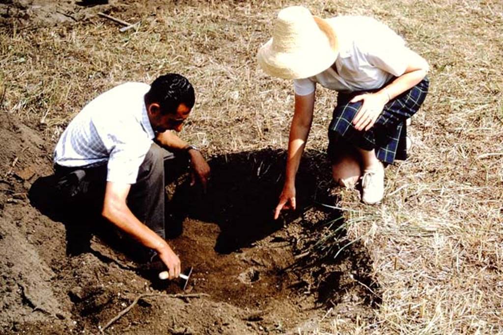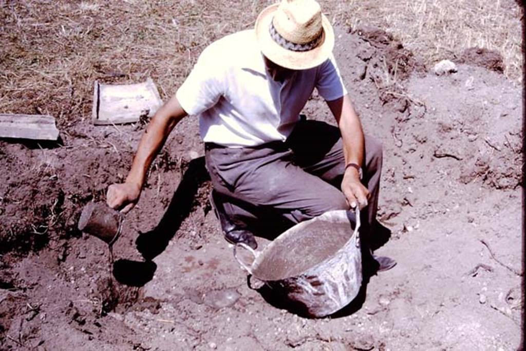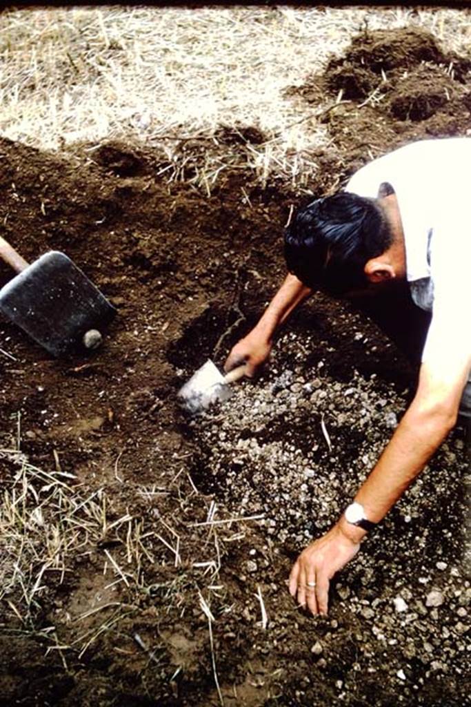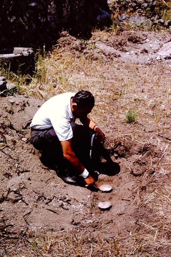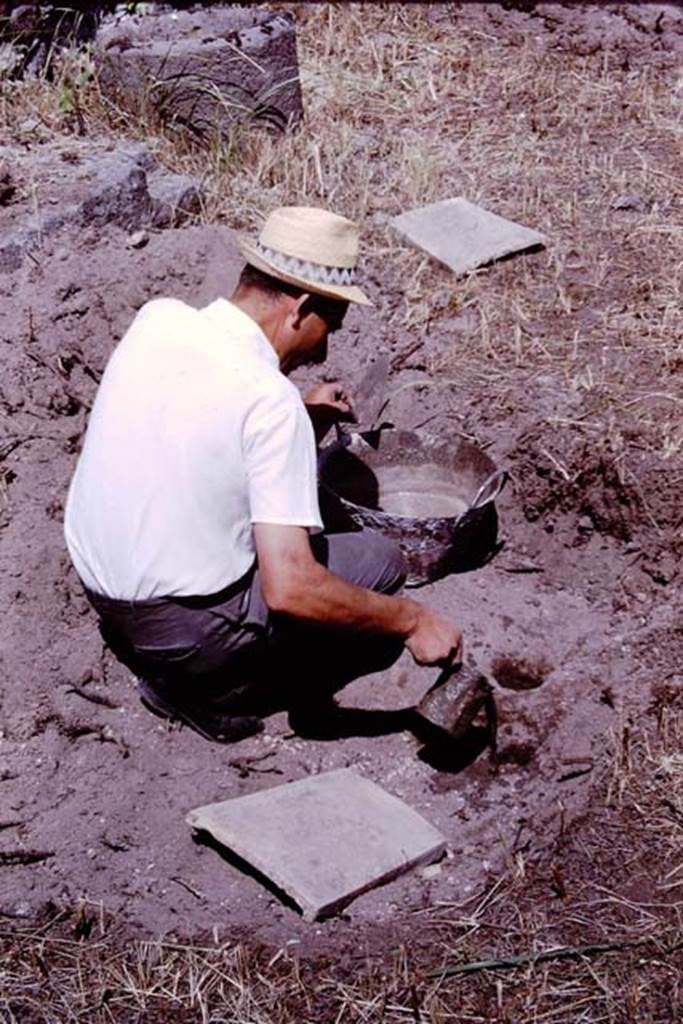 IX.9.6/10 Pompeii. 1964. Gently removing the soil from around them. Photo by Stanley A. Jashemski.