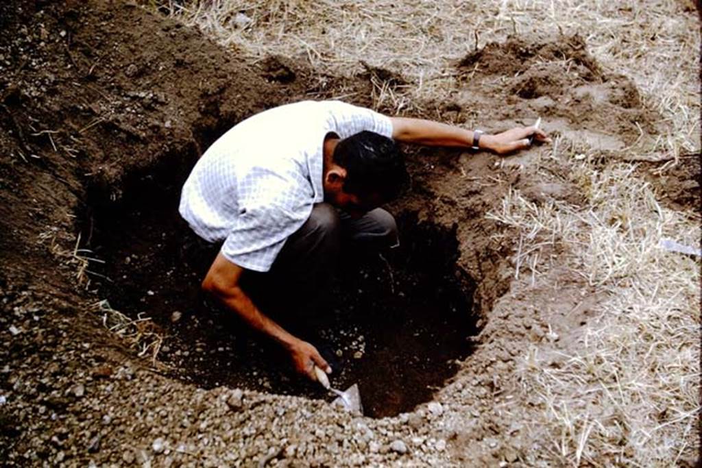 IX.9.6/10 Pompeii. 1964. Nicola Sicignano, deep in thought and in his excavation. Photo by Stanley A. Jashemski.
