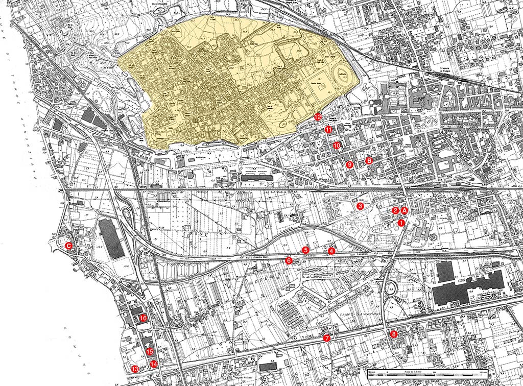 Tempio dionisiaco in località Sant’Abbondio di Pompei. Temples Plan after Guzzo 2005, p. 12-13, amended to include the Sanctuary adjacent to the west wall of Pompeii.