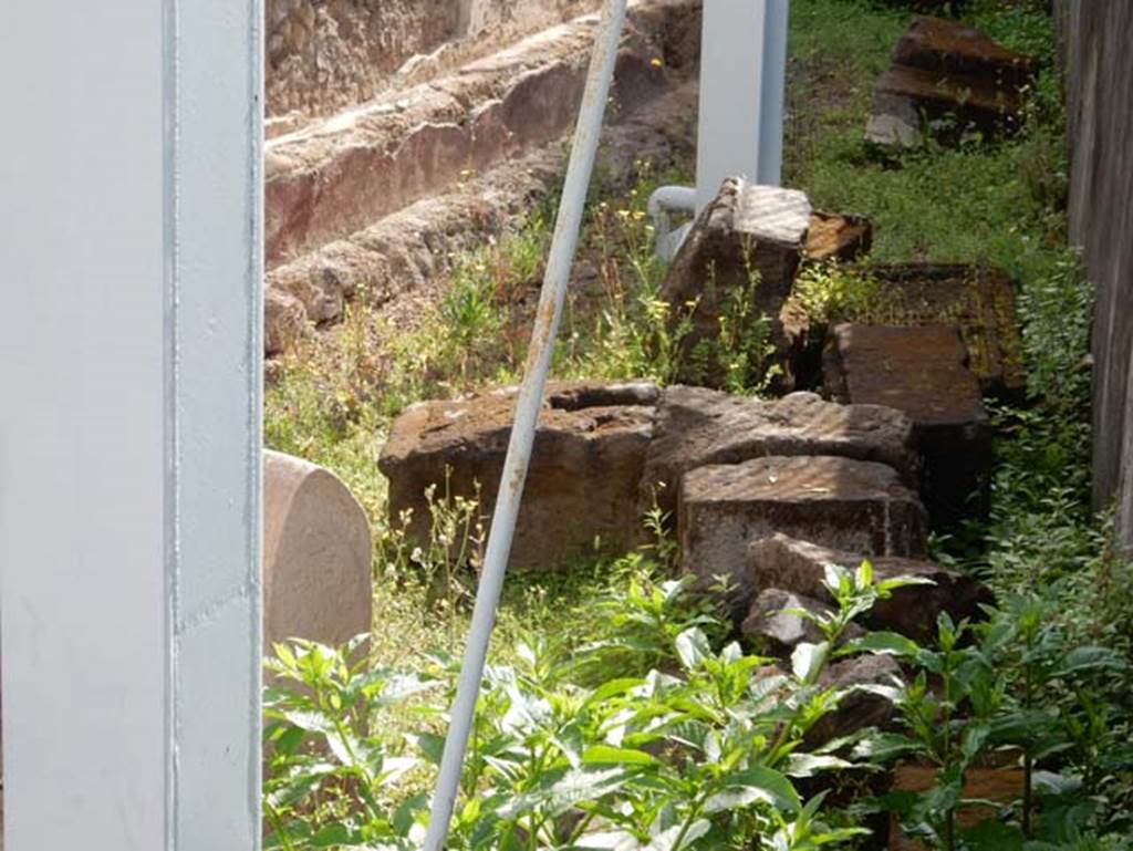 Tempio dionisiaco in località Sant’Abbondio di Pompei. May 2018. Carved masonry on ground. Photo courtesy of Buzz Ferebee.