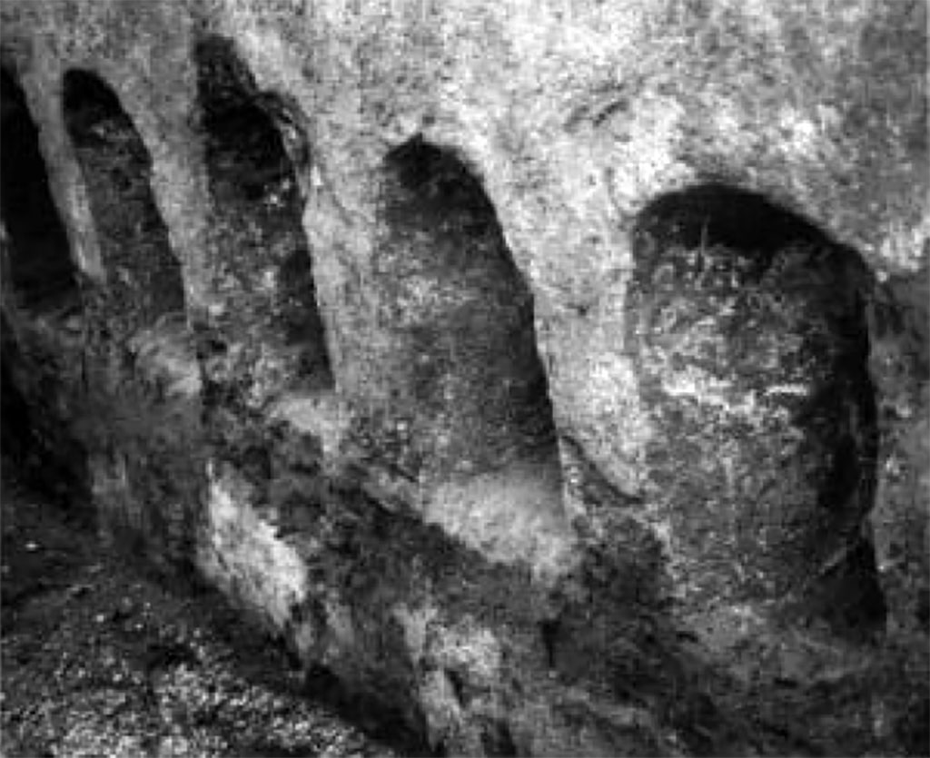 Nothing was found in the cubiculum "no.1 and no.2”;  towards the east wall of the anteroom of the next cubiculum “no.3”, where the impressions left by a large wooden cupboard were found, the following bronzes were gathered: an ovoid cooking pot, in fragments, 0.30m high; fragments of a basin of 0.30m in diameter, with the handles ending in heads of snakes; an ovoid cooking pot, 0.28m high; two rings of 0.03 m in diameter.