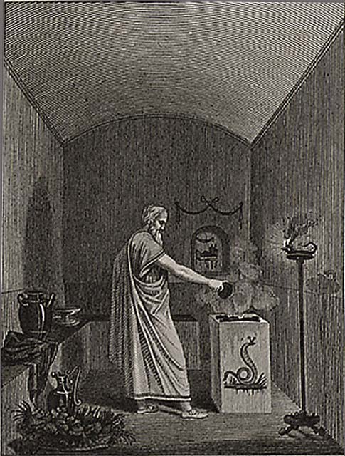 VI.1.1 Pompeii. Drawing by Mazois, 1824, of windowless sacrarium, looking north.