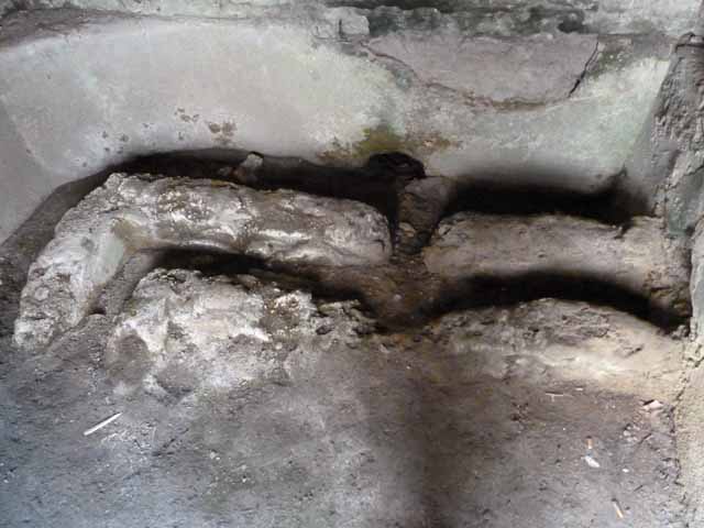 Villa of Mysteries, Pompeii. May 2010. Room 40, remains of water channel, near south wall.