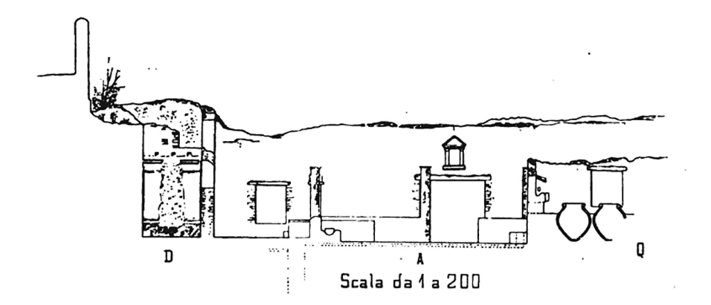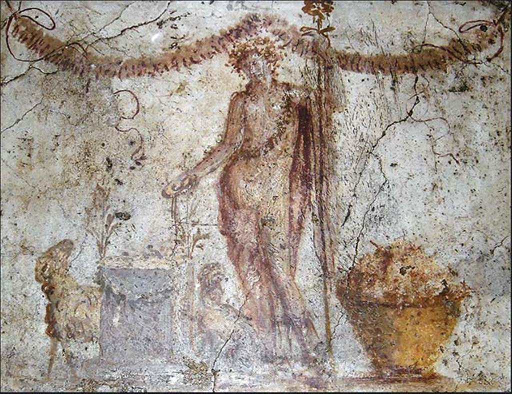 Entering the workshop, two areas are presented to the attentive observer, of which the first (p) remains disfigured for some medieval constructions (q) leaning against the ancient walls, or settled in all directions on the shattered ruins mixed with the ash and lapillus of 79, and up to two metres high above the ancient floor, so that some walls fell removing those ruins. These constructions prevent recognition of the underlying works, which are preceded by a small column that overlays the ruins below. Thus a wall arm, which went to meet the ancient wall that delimits the two areas, had hidden a valuable painting. Randomly recognized by us and freed from the wall that kept it hidden, it was possible to recognize the representation of the Genius familiare, who wrapped up to his head in a white toga, is standing to sacrifice before a round altar. He is located between two Lares, of which the one on the left is completely destroyed. To the right, after the Lar, is Pan horned and crowned who is represented in act of surprise, if not of threat. A similar figure, visible only in the lower part of the body, is also on the left. after the destroyed Lar. This representation of Pan as Penate was recognized as unusual by the illustrious Prof. Sogliano, Inspector of the Pompeii excavations (Cf. Le Pitture Murali Campane of the same Prof Sogliano); hence the painting is carefully preserved by Avv. Longo, while a copy, by the artist Di Scanno, can be found in the National Museum of Naples.