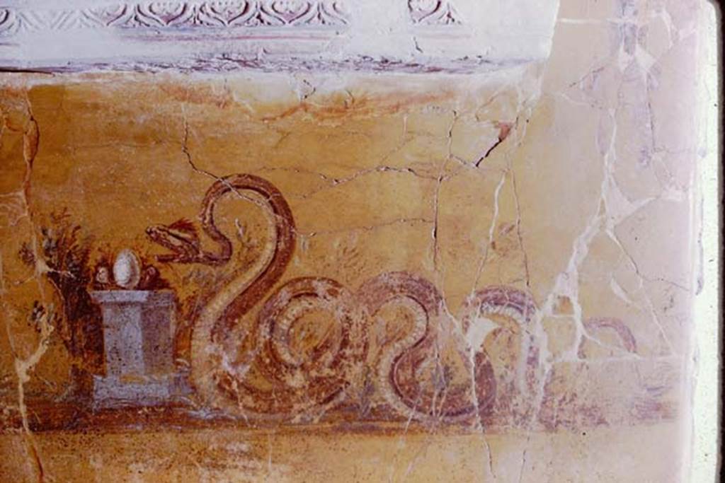 “In a room probably intended for the non-free members of the familia, a niche was created with a cultural function in a recess in the south wall; this lararium niche interrupted the Fourth Style fresco that decorated the room, which is also present on the west wall. The other walls are devoid of decoration and simply plastered.”