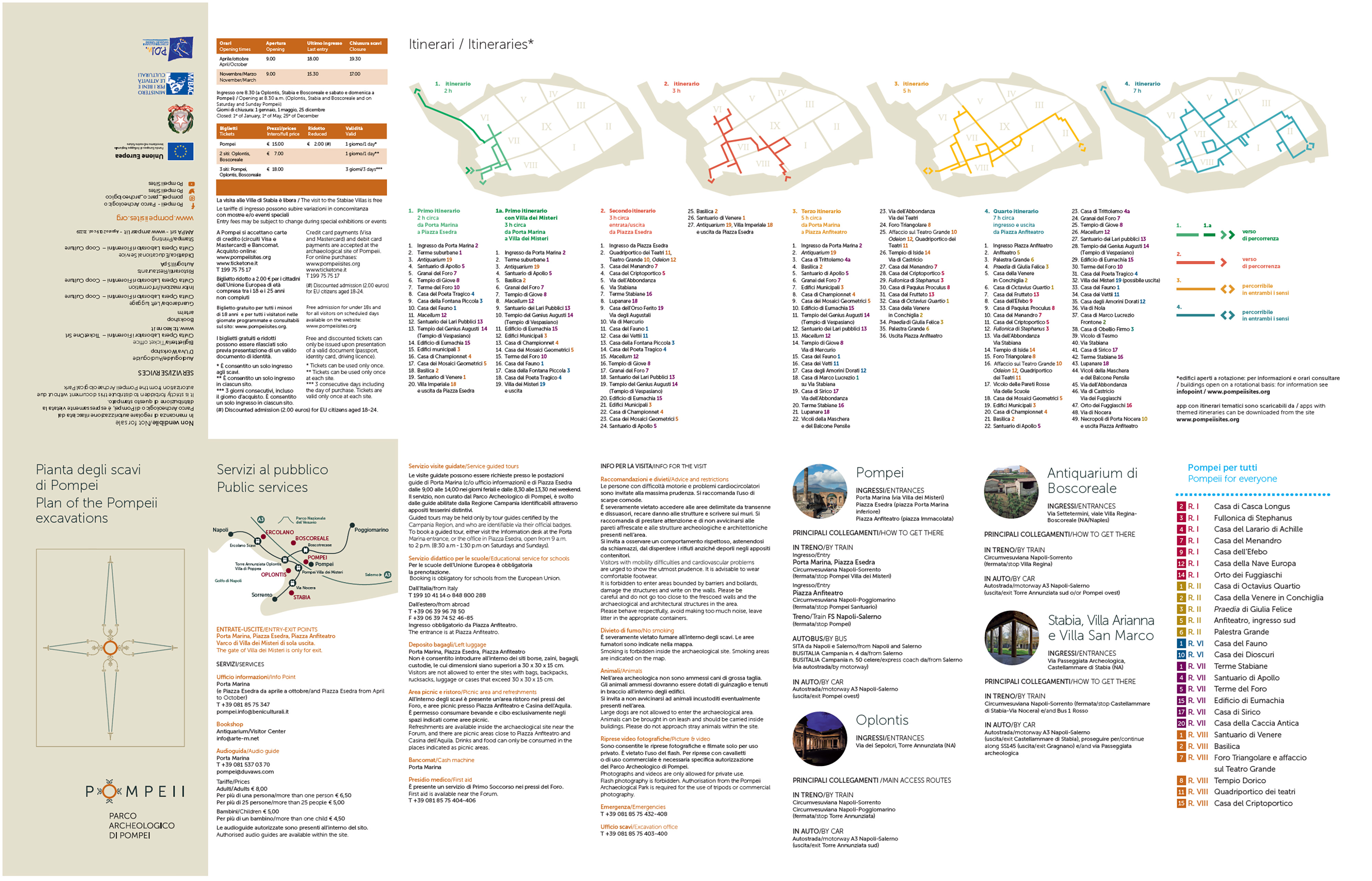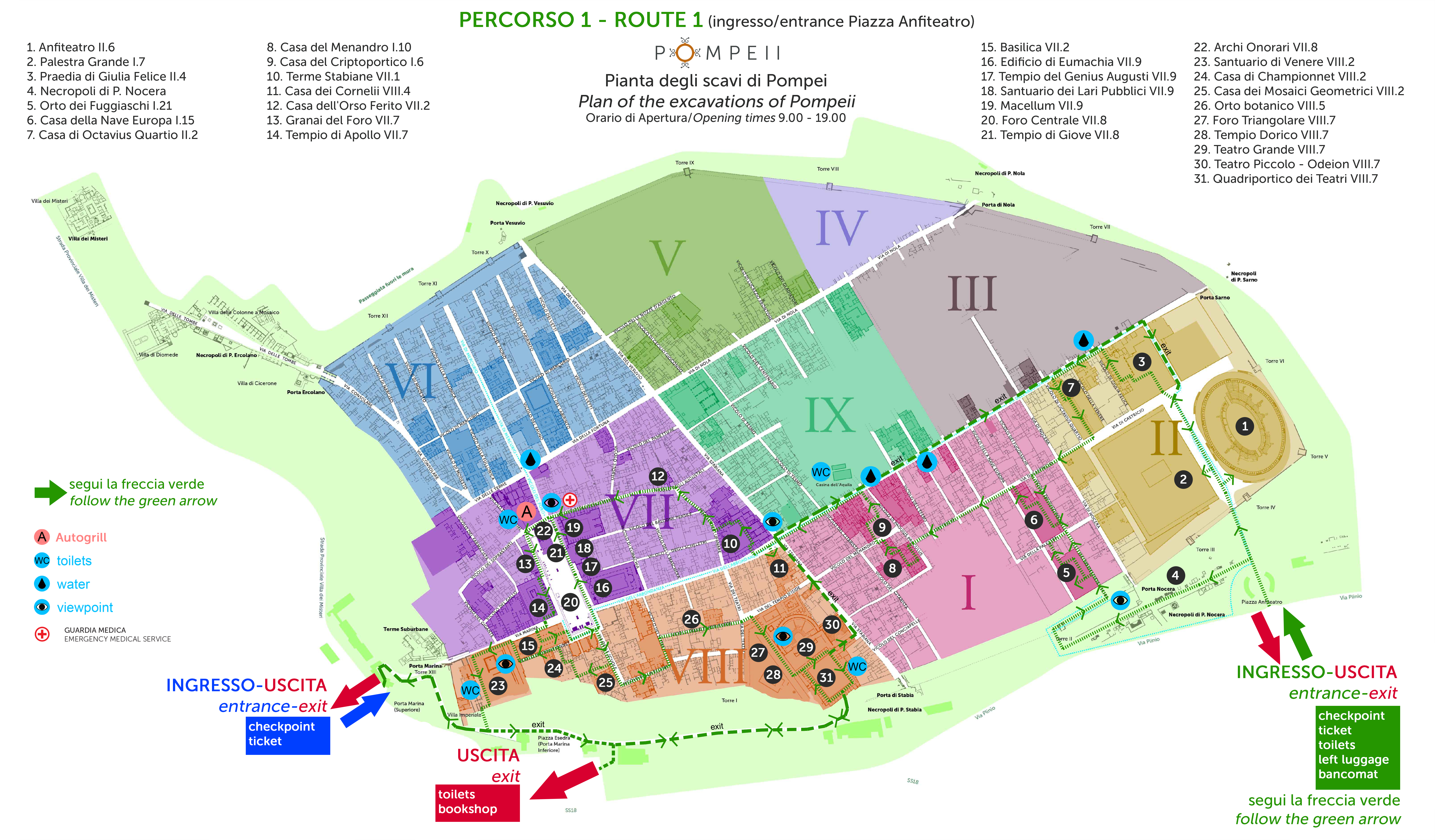 2019 Parco Archeologico di Pompeii tourist plan itineries showing the main buildings. Not all of these are currently open to the public.