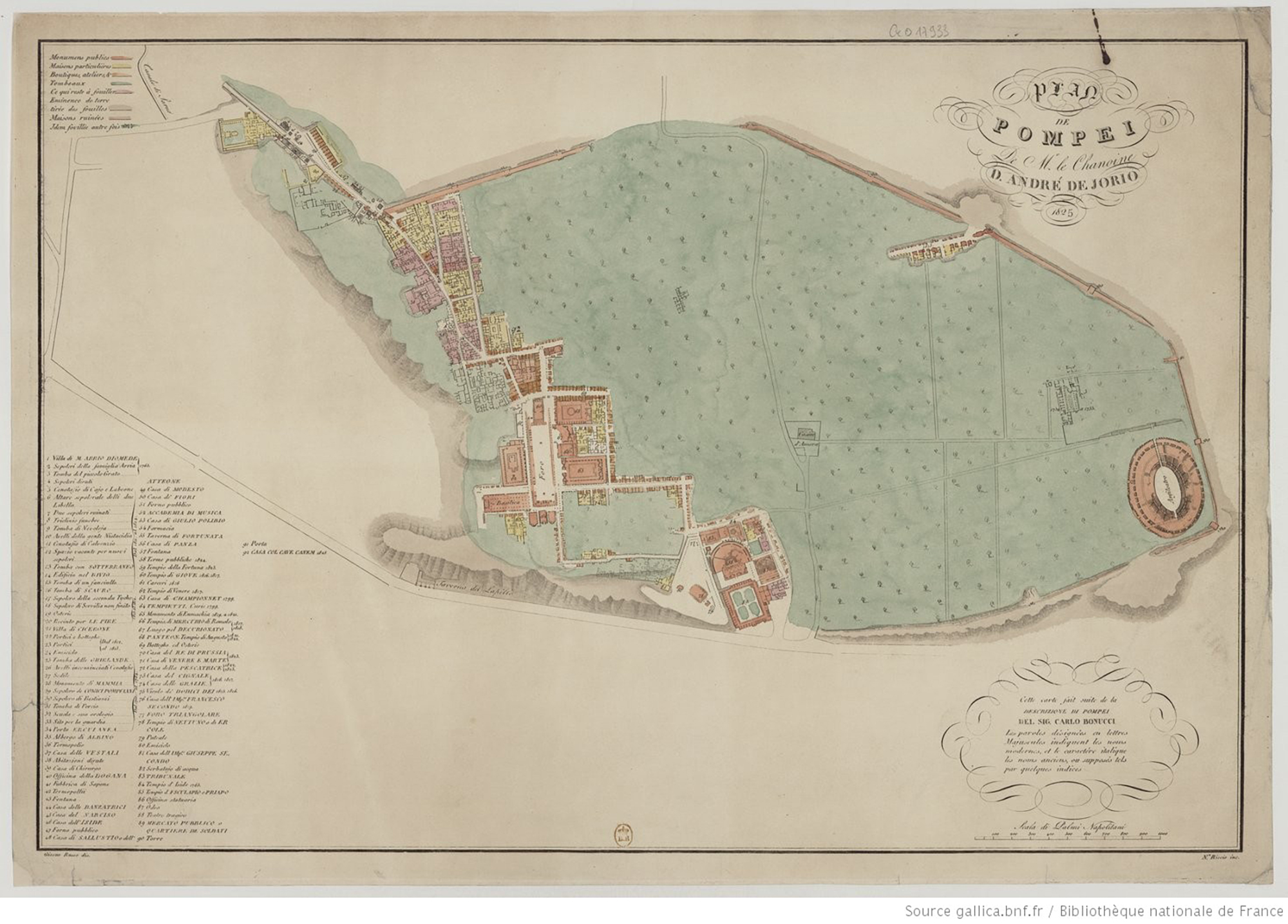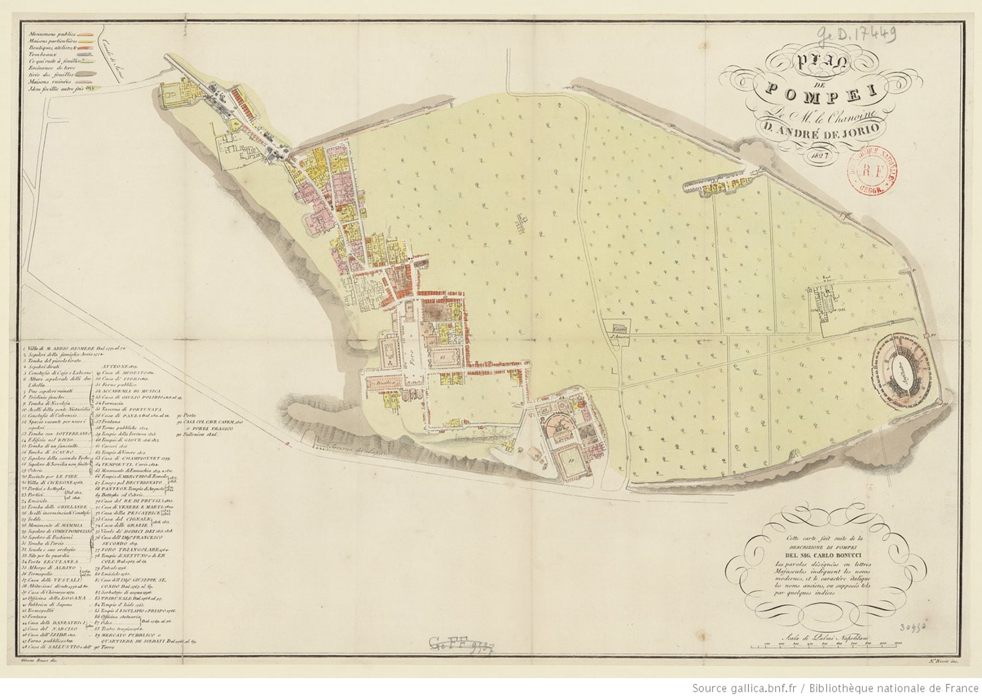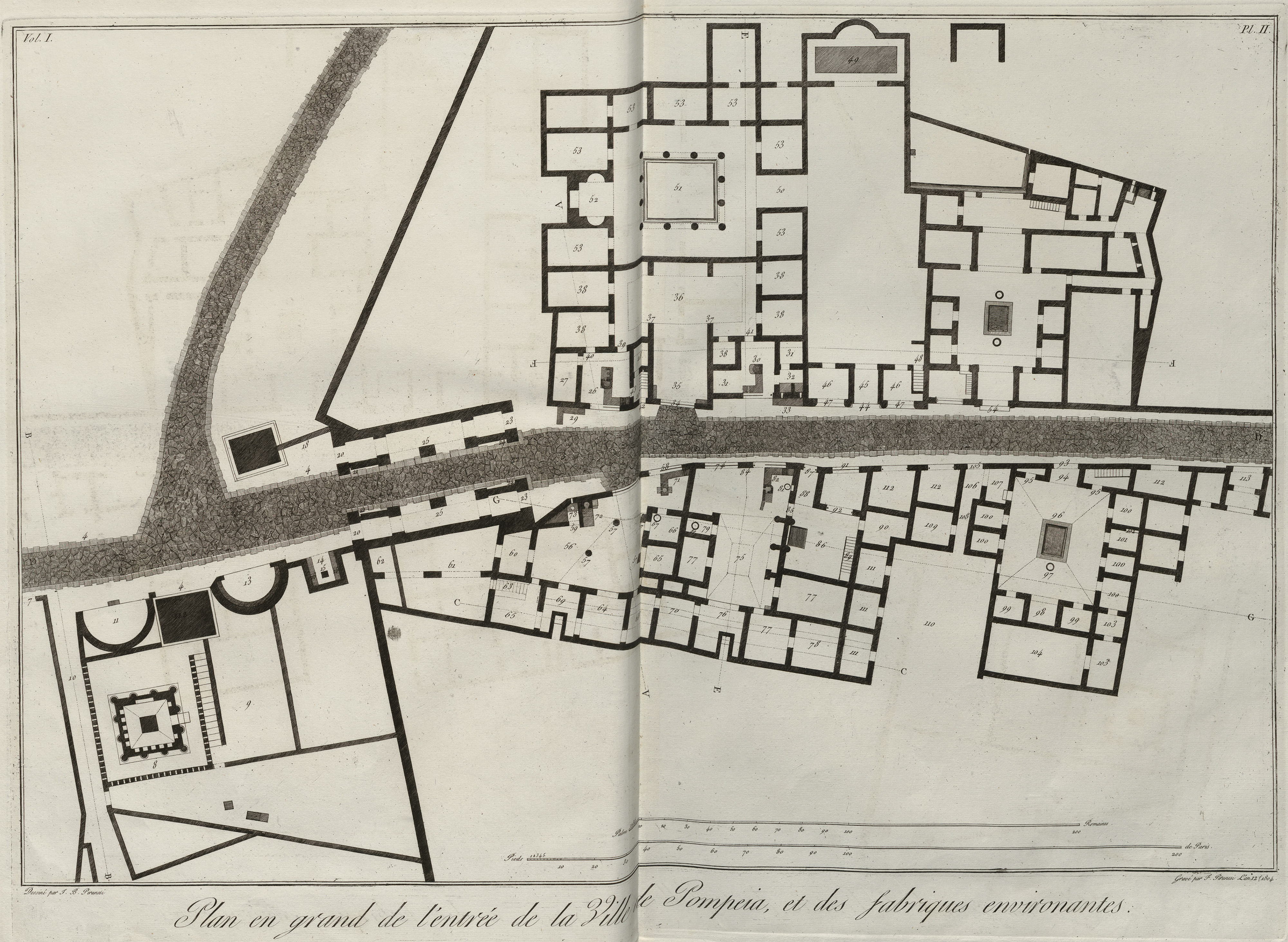 The first plan of Pompeii published in February 1776 by Francois-De-Paule Latapie. He drew the map from memory after visiting Pompeii, as such activities were not allowed during visits at that time, and made a presentation to l’Académie Reale di Scienzi, Lettere ed Arte de Bordeaux.