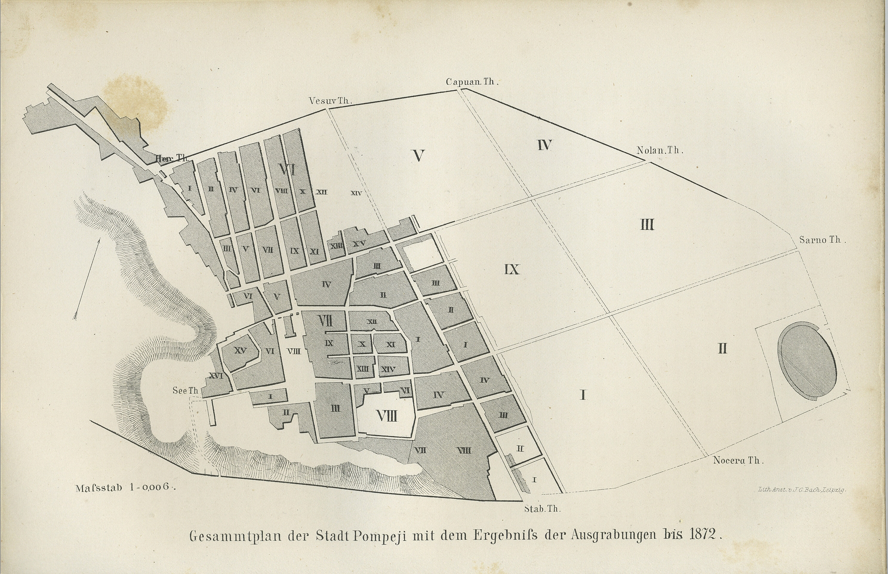 Plan of Pompeii excavations from 1754-1855 by J. G. Bach. Published by Overbeck in 1855.