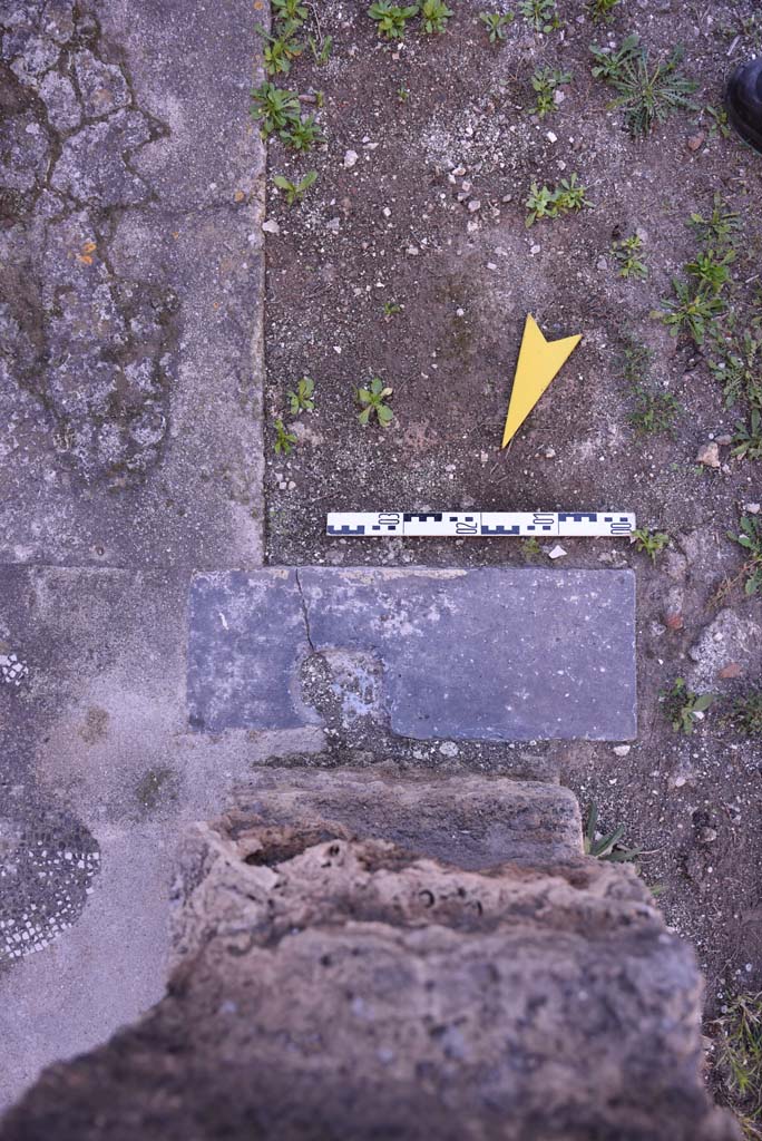 October 2019. Room 34, detail of doorway threshold at north end of doorway.