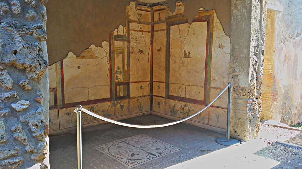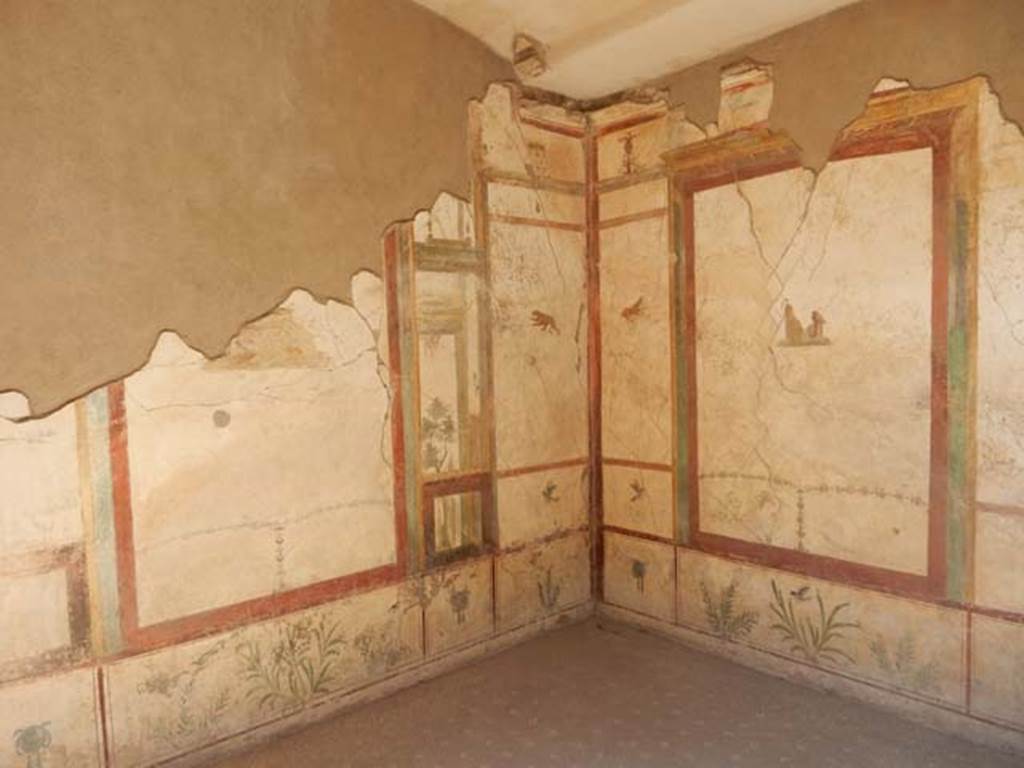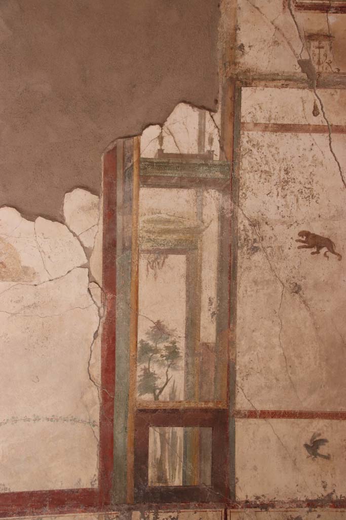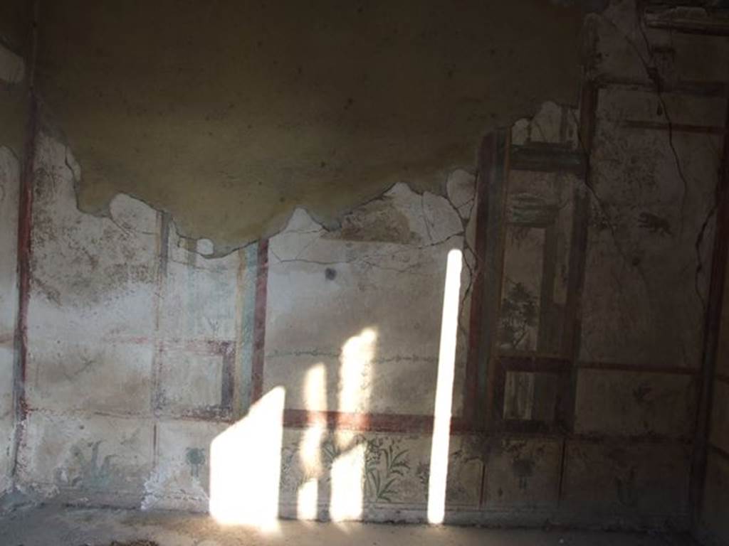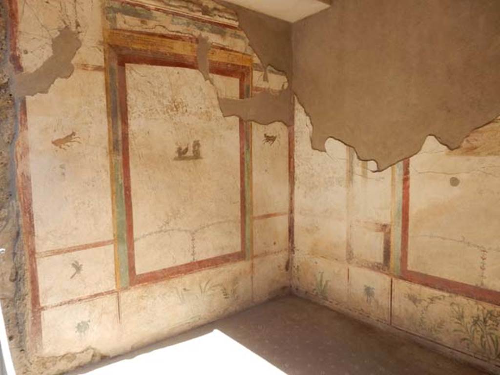 I.7.11 Pompeii. May 2017. Detail of painted panels in south-east corner of exedra. Photo courtesy of Buzz Ferebee.