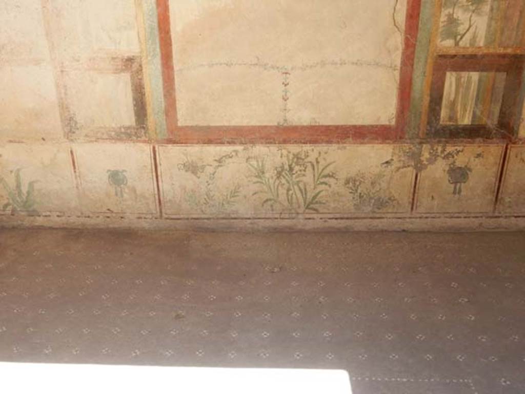 I.7.11 Pompeii. May 2017. Detail of zoccolo (lower wall) in centre of east wall, with painted plants. Photo courtesy of Buzz Ferebee.
