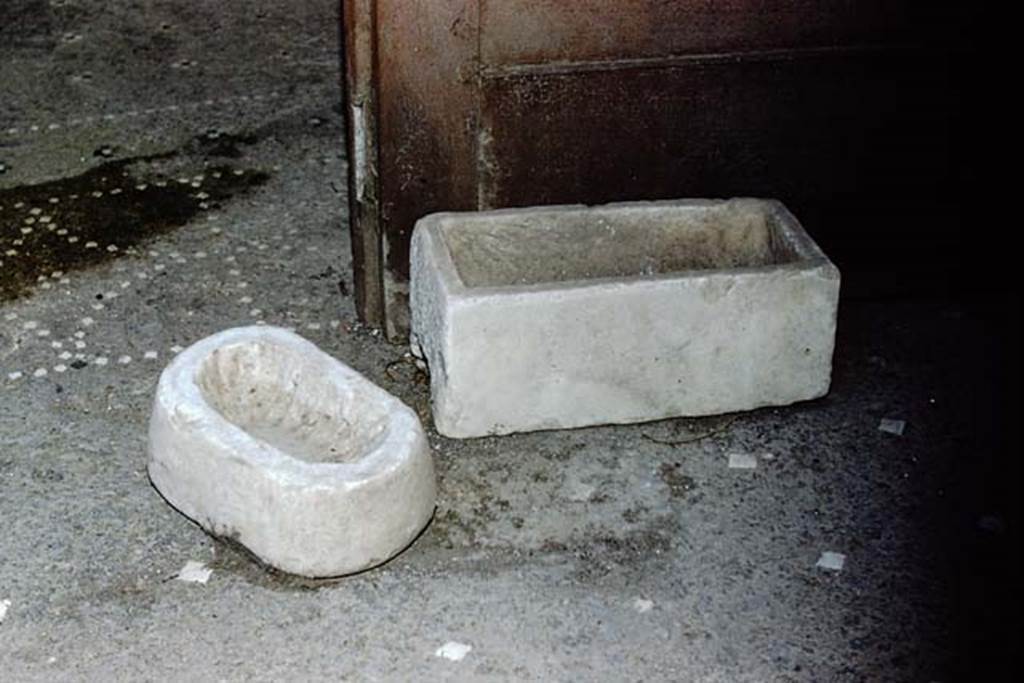 Pompeii. 1959. Marble items on the floor outside of the door leading into the