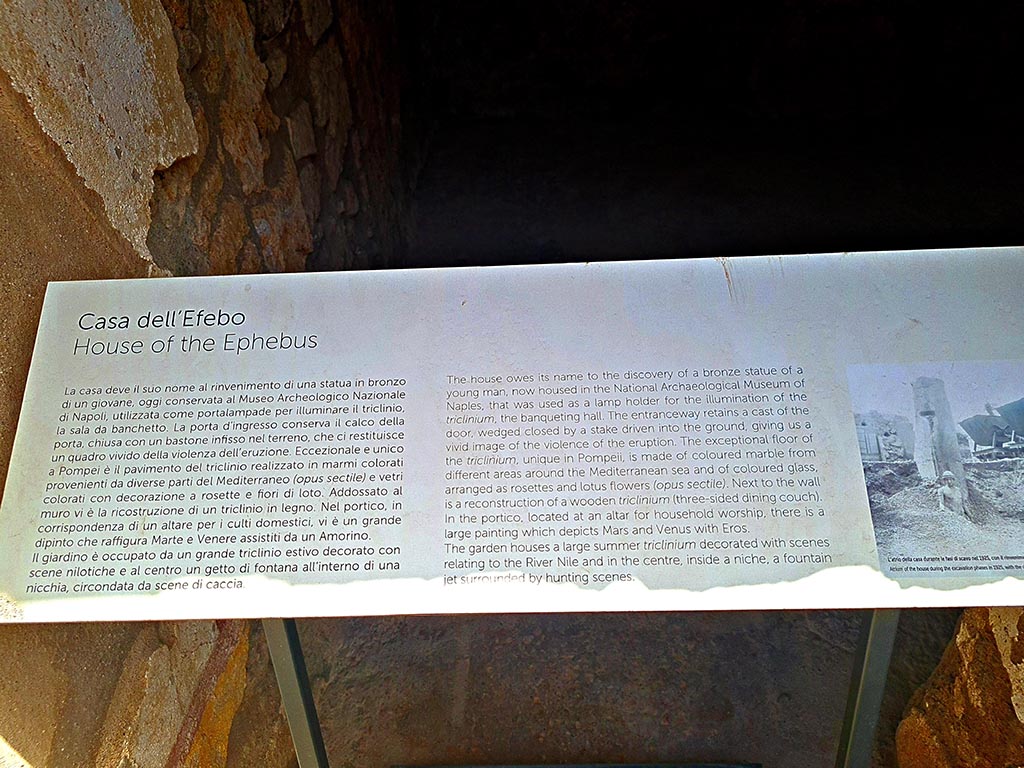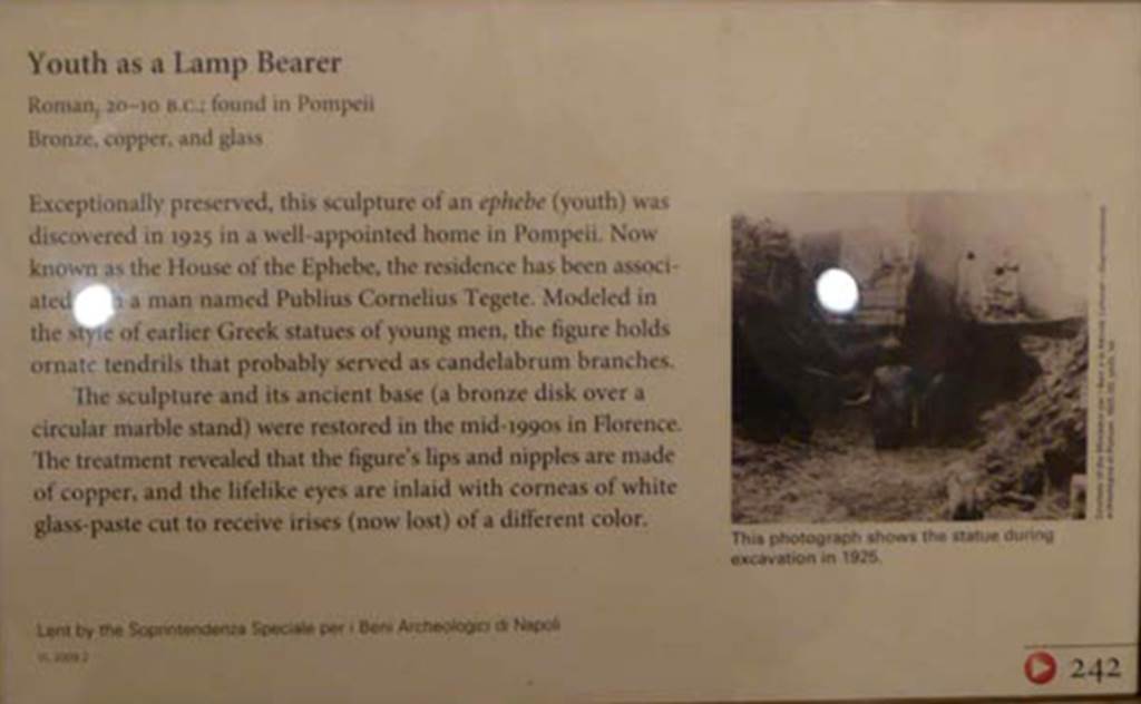 I.7.11 Pompeii. 2010. Getty Museum card describing the bronze statue of the ephebo. Photo courtesy of Buzz Ferebee.