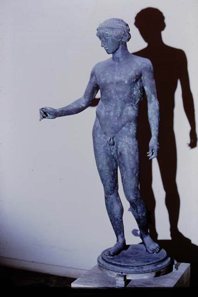 I.7.11 Pompeii. Found 25-26th May 1925, on south side of atrium near tablinum. Bronze statue of the ephebo.