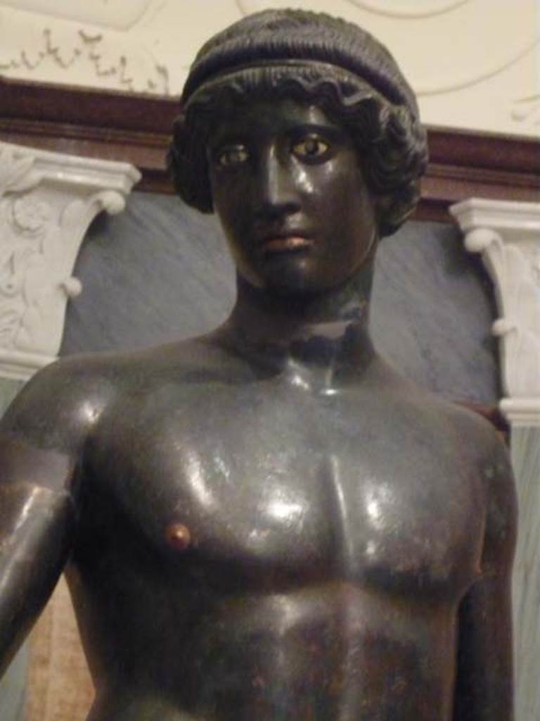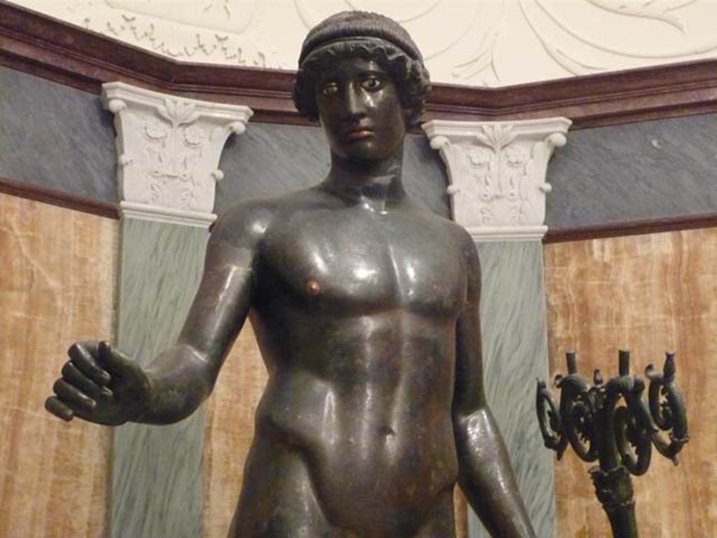 Upper part of bronze statue of the ephebo from south side of atrium near tablinum. Photo courtesy of Buzz Ferebee.