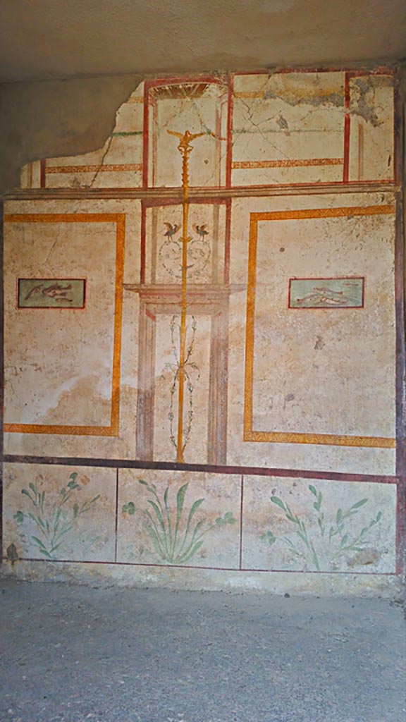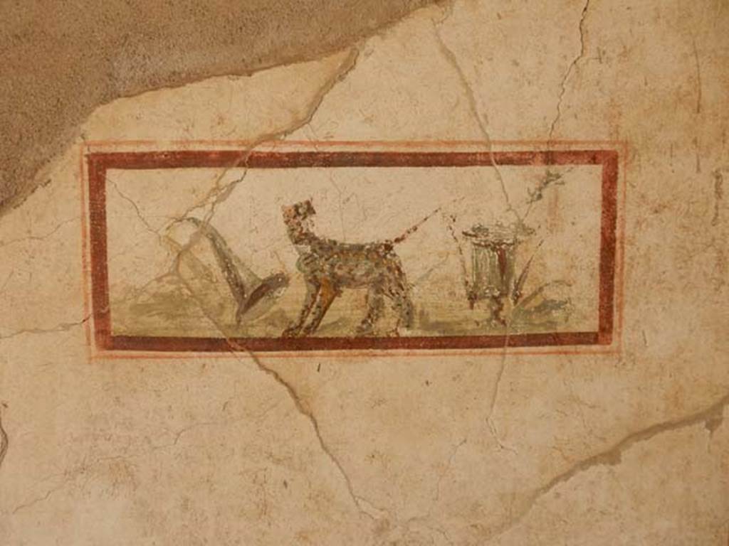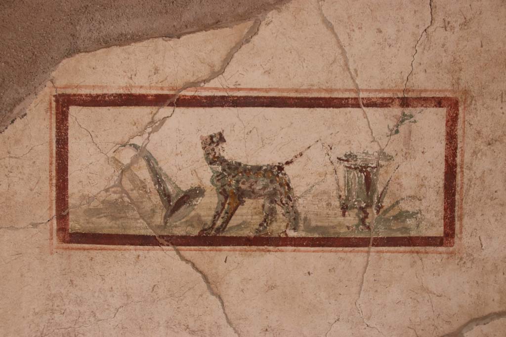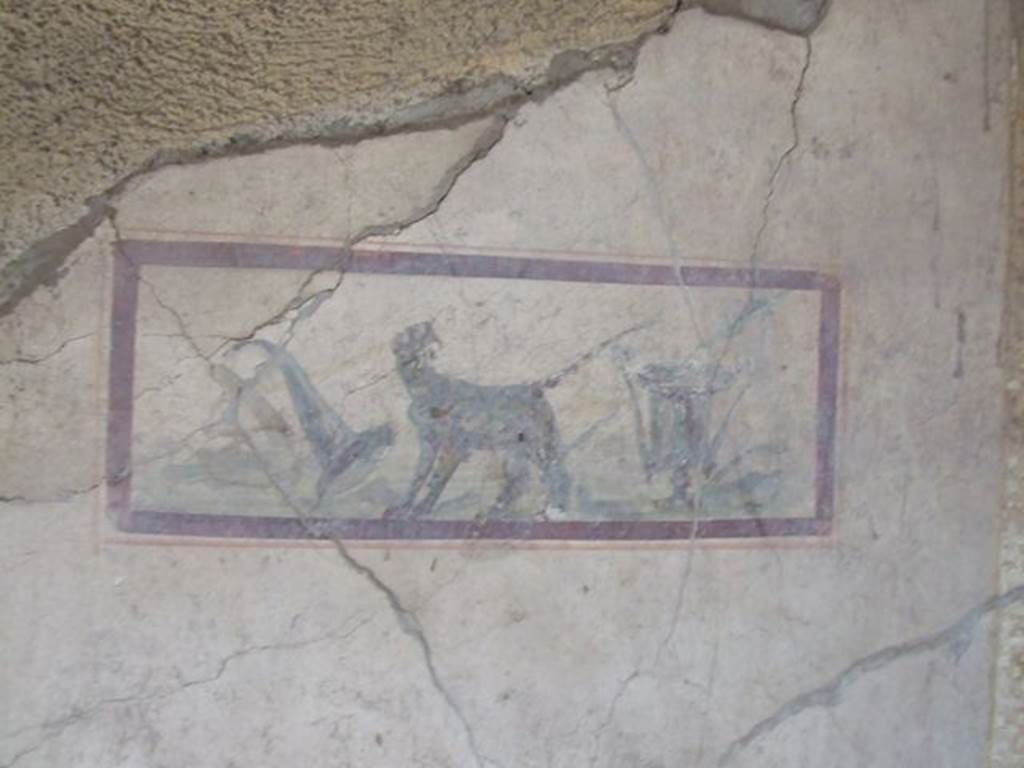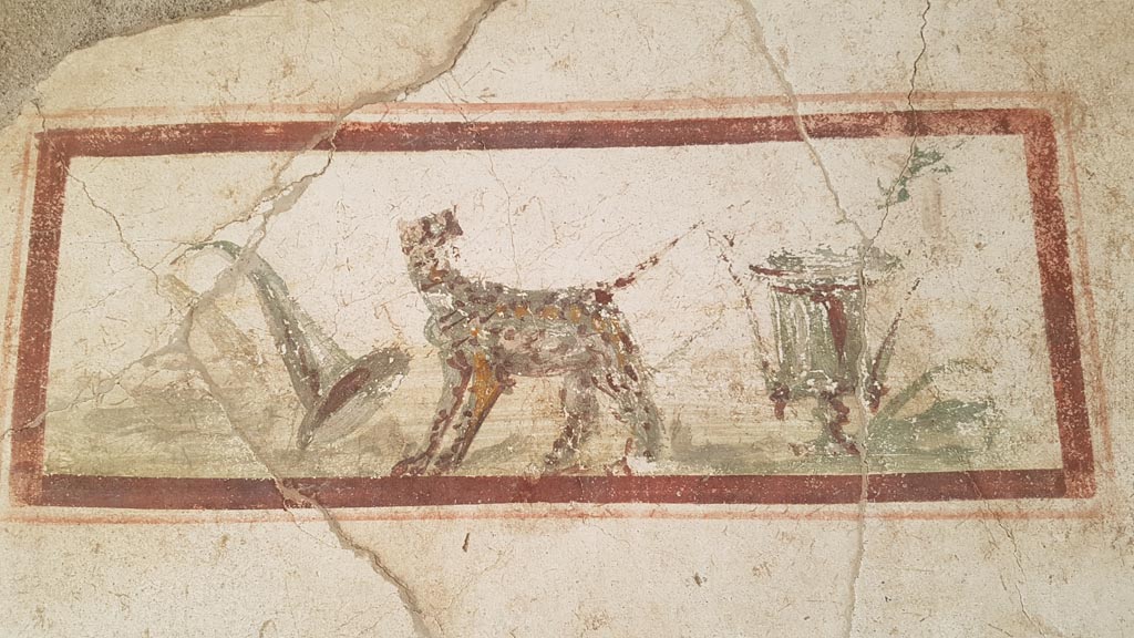 East wall of cubiculum to south-east of atrium, wall painting of panther, cup and cornucopia, the attributes of Dionysus.