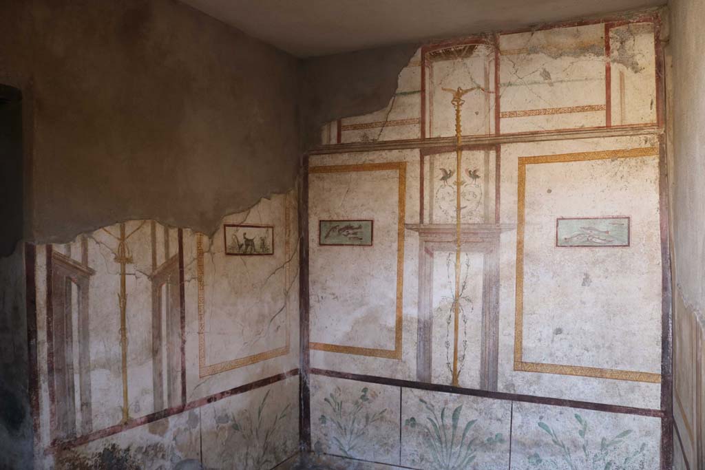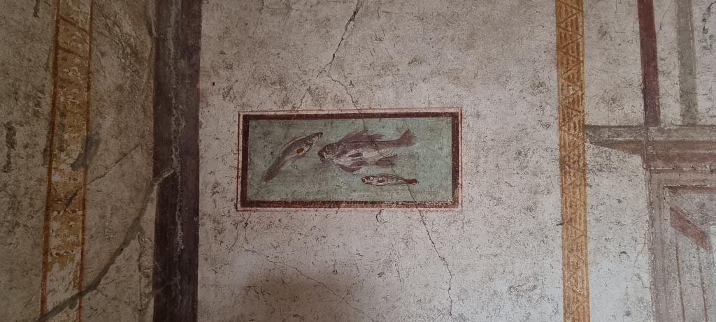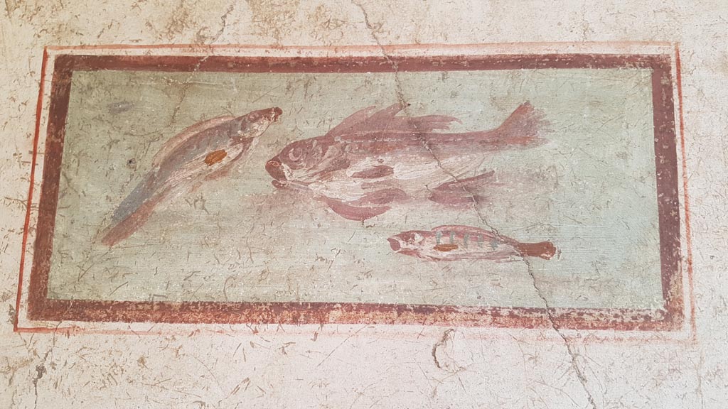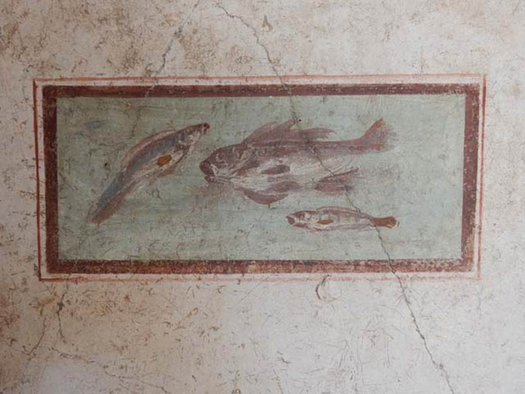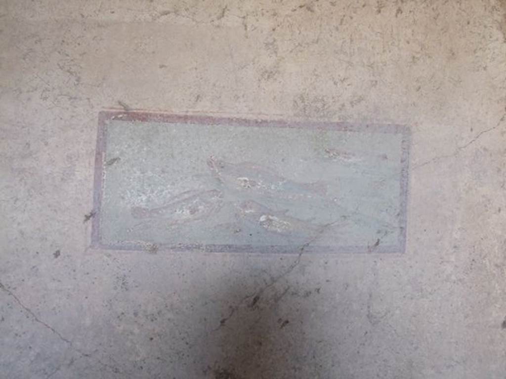 I.7.11 Pompeii. December 2023. Wall painting of fish from east end of south wall of cubiculum. Photo courtesy of Miriam Colomer.