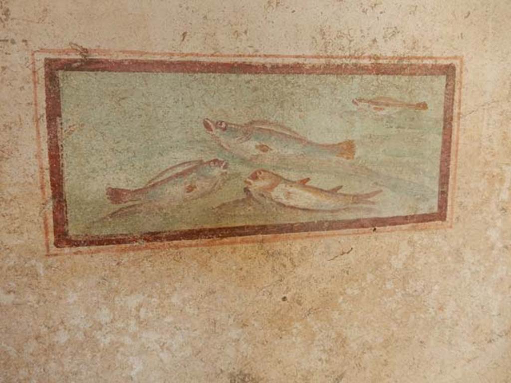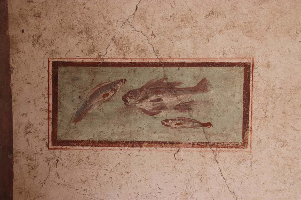South wall of cubiculum to south-east of atrium, wall painting of fish from east end of south wall. Photo courtesy of Buzz Ferebee.