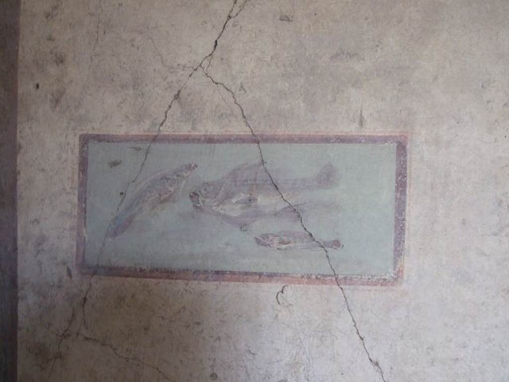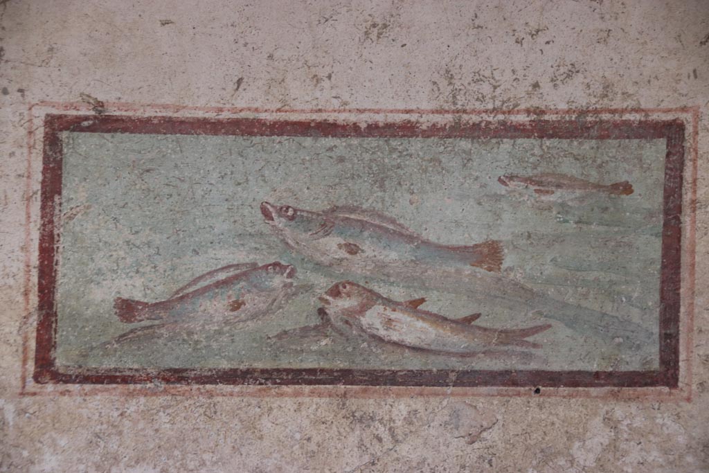 South wall of cubiculum to south-east of atrium, wall painting of fish from west end of south wall. Photo courtesy of Buzz Ferebee.
