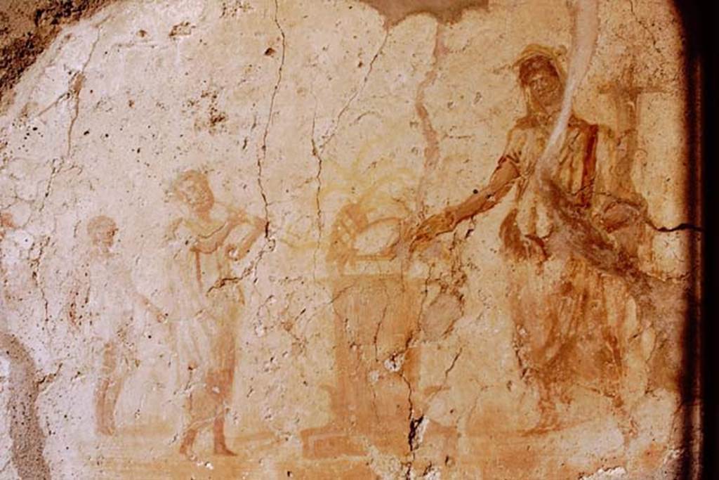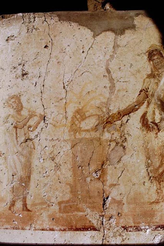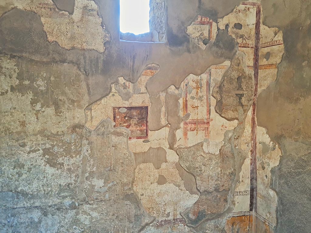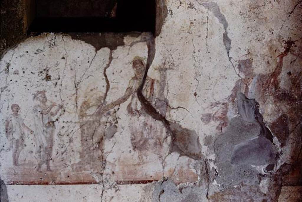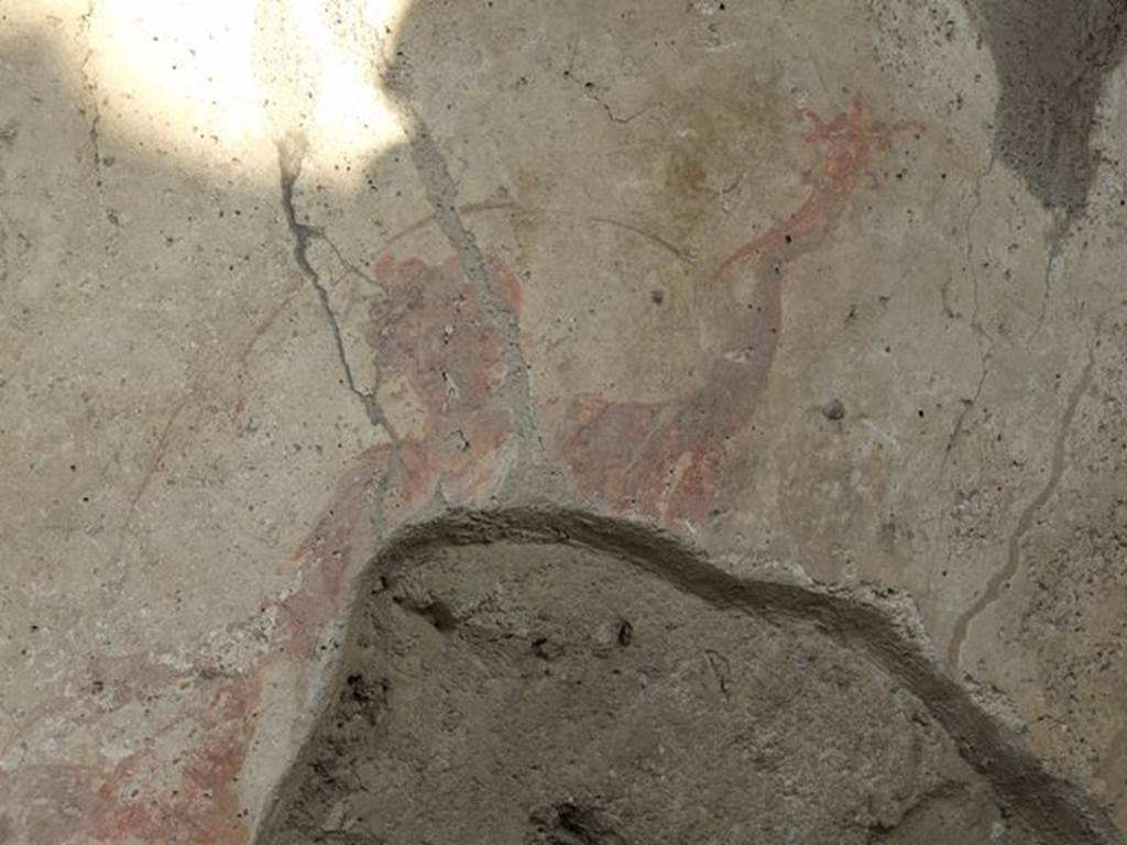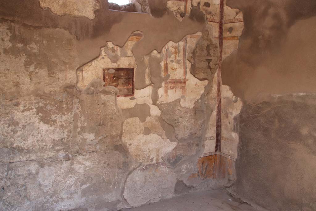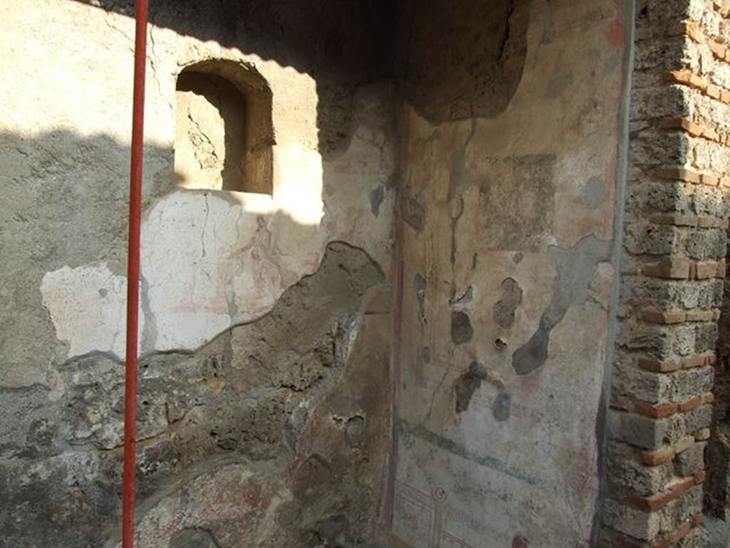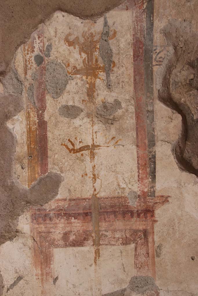 Remains of lararium painting with niche set into the wall above it. On the south wall can be seen the remains of a painting.