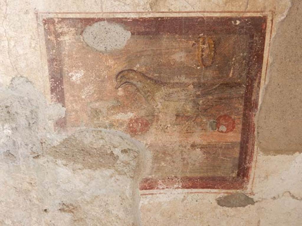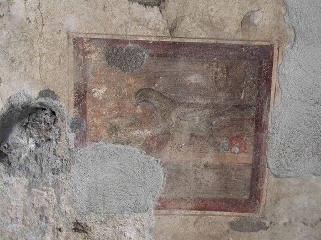 I.7.11 Pompeii. May 2017. Wall painting of bird with vase, on east wall under window. Photo courtesy of Buzz Ferebee.