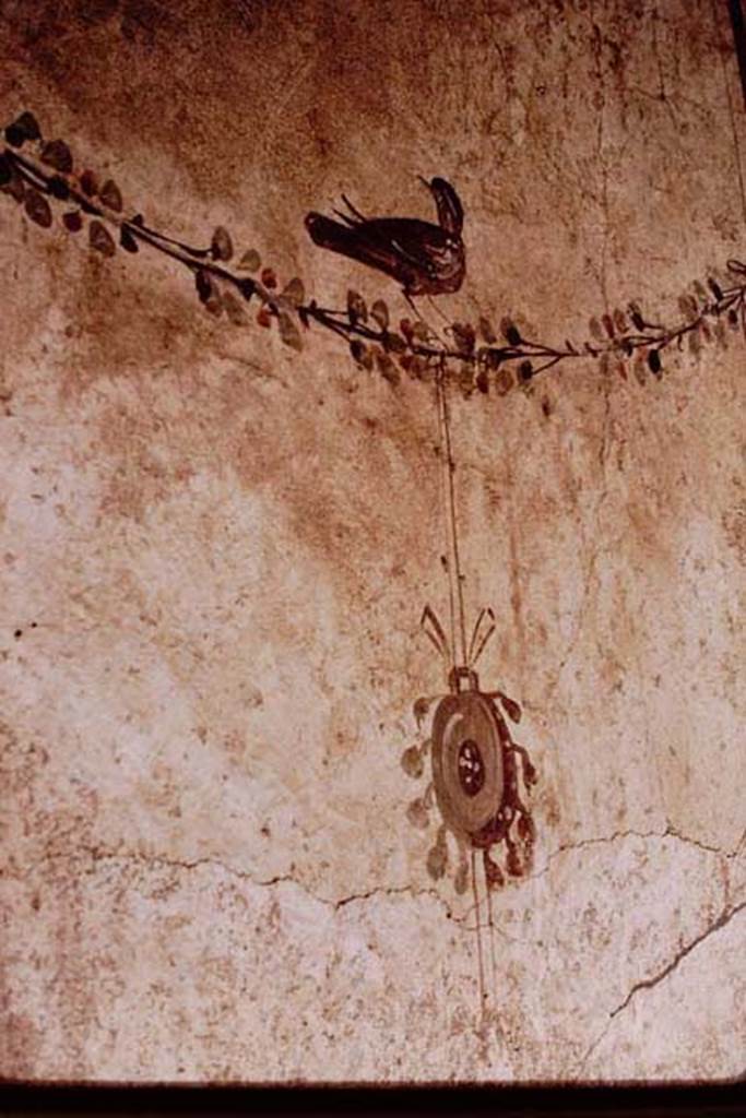 South wall of bath-room, painted panel on east end of bird on a garland on which a tambourine was hanging.