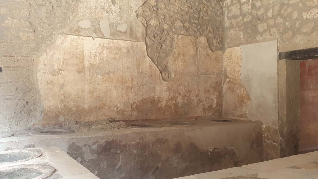 I.8.8 Pompeii. July 2021. Looking north along west wall of bar-room.