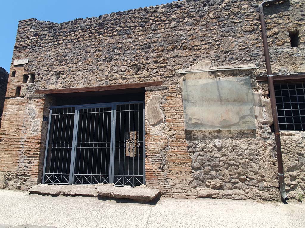 I.8.15 Pompeii. July 2021. Looking north to entrance doorway, with graffiti, on right.