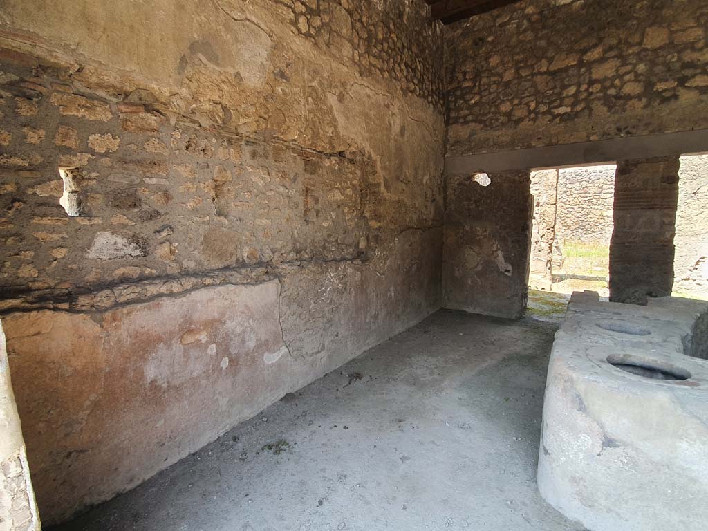 I.8.15 Pompeii. July 2021. Looking north across counter towards doorways to two rear rooms.