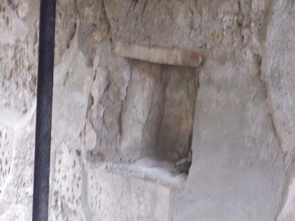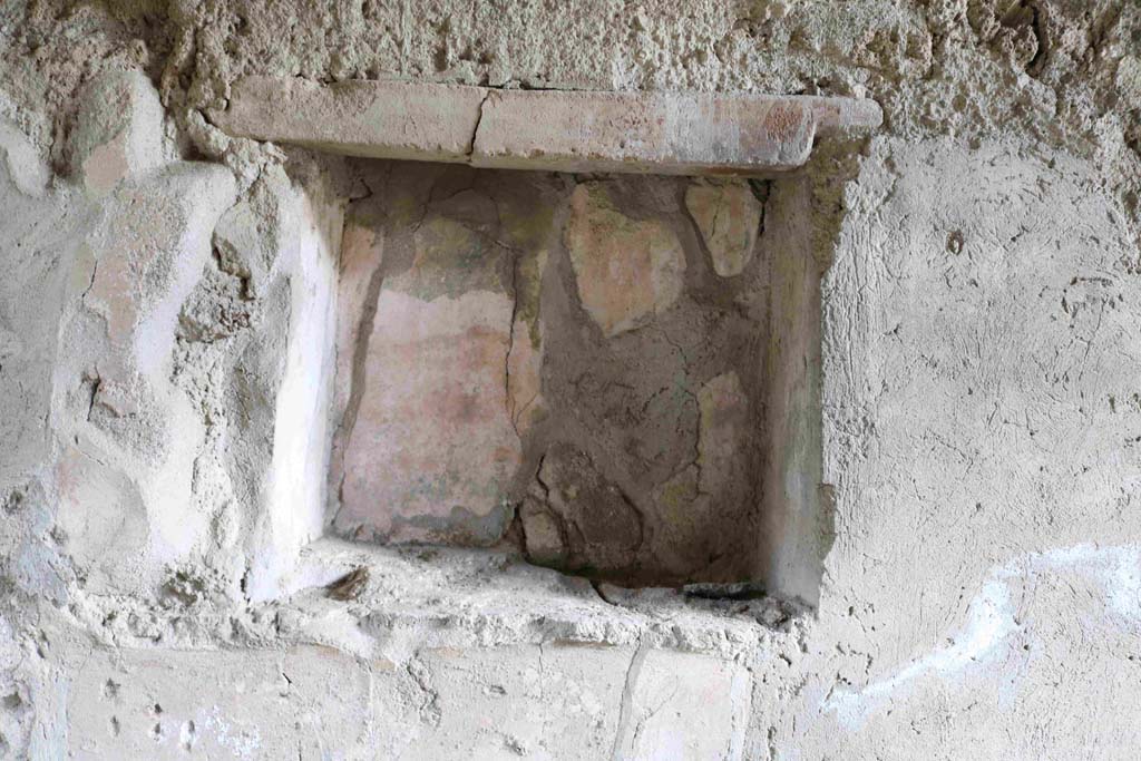 Looking towards east wall with niche, and broken dolium set in counter below. Photo courtesy of Nicolas Monteix.