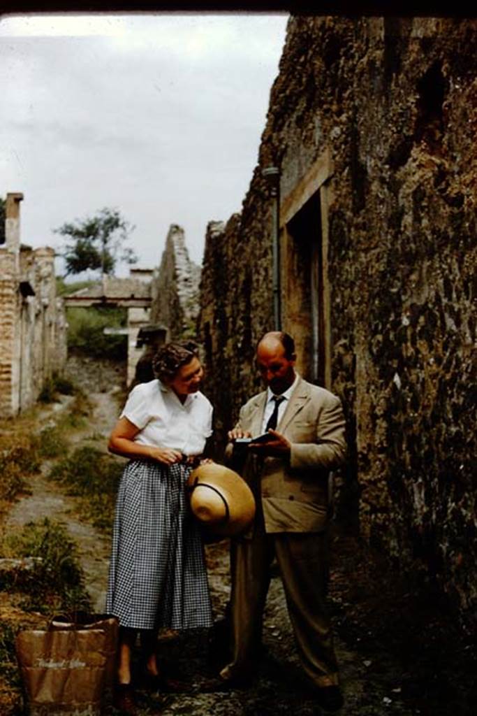I.8.19 Pompeii. 1959. Wilhelmina and colleague outside entrance.