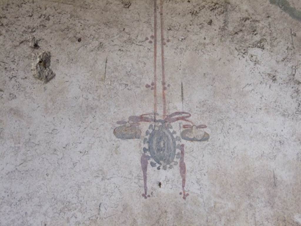 I.10.11 Pompeii. March 2009. Room 10, painting of hanging tambourine from east end of north wall of peristyle.